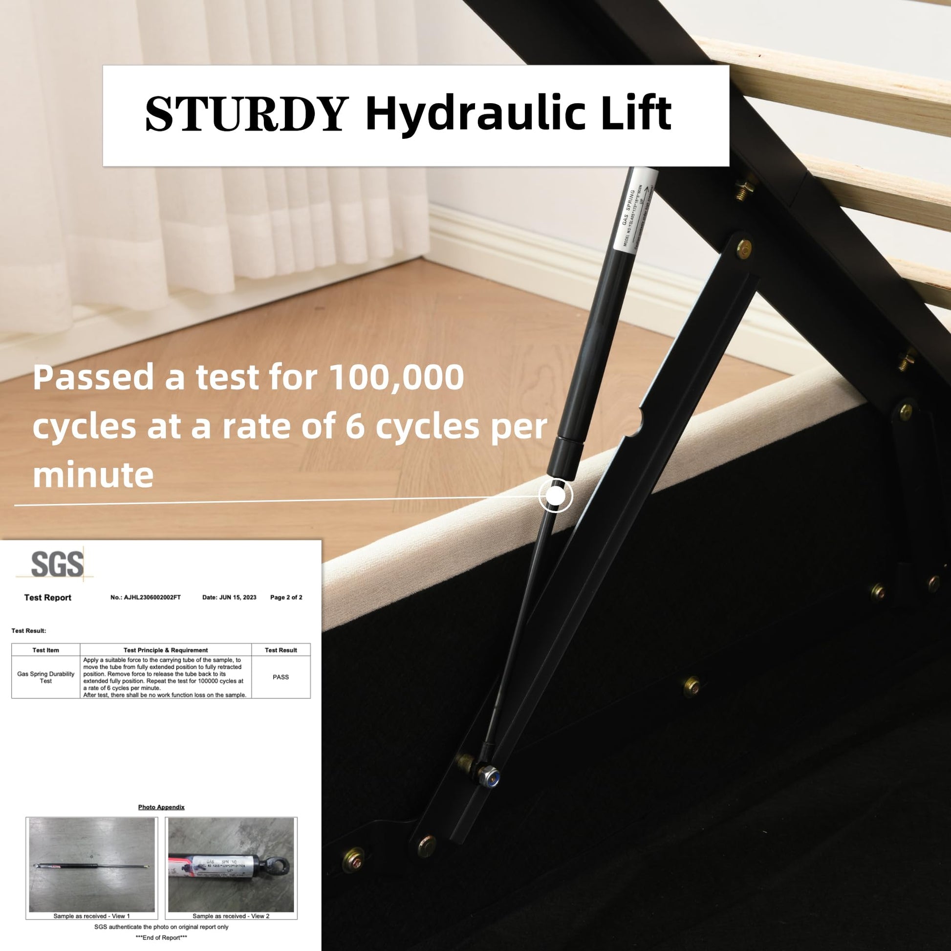 Built with a durable metal frame and solid wood slat support system, this queen bed ensures long-lasting stability without the need for a box spring. The sturdy construction supports your mattress evenly, reducing sagging and extending its lifespan. The lift-up hydraulic mechanism is designed for smooth, effortless operation, allowing you to access the under-bed storage space with ease.