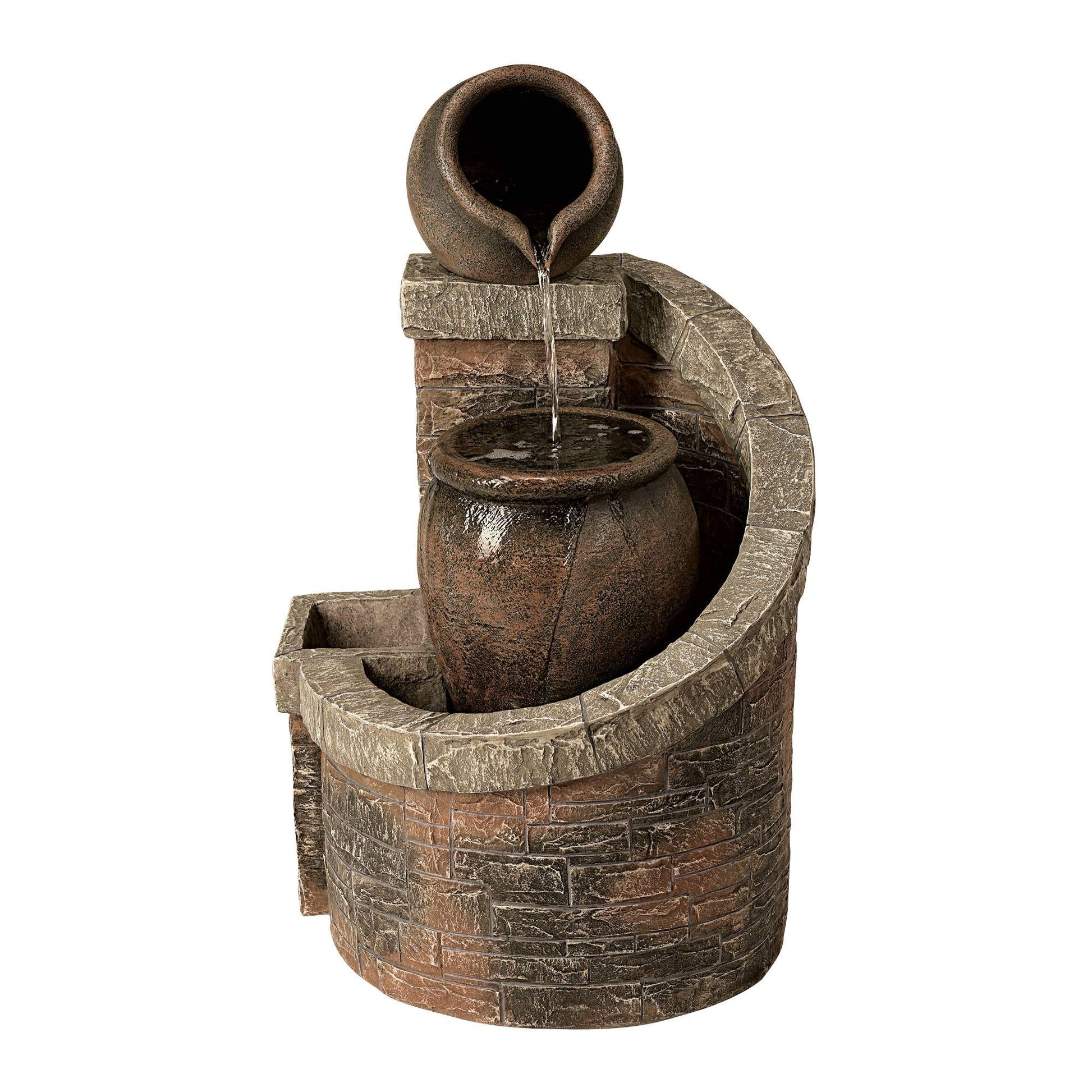 - A resin fountain, lawn fountain, or urn-style garden waterfall adds character to your outdoor waterfall, making it the perfect centerpiece for a porch fountain or backyard waterfall. Built-in light in bottom jug illuminates the design at night.