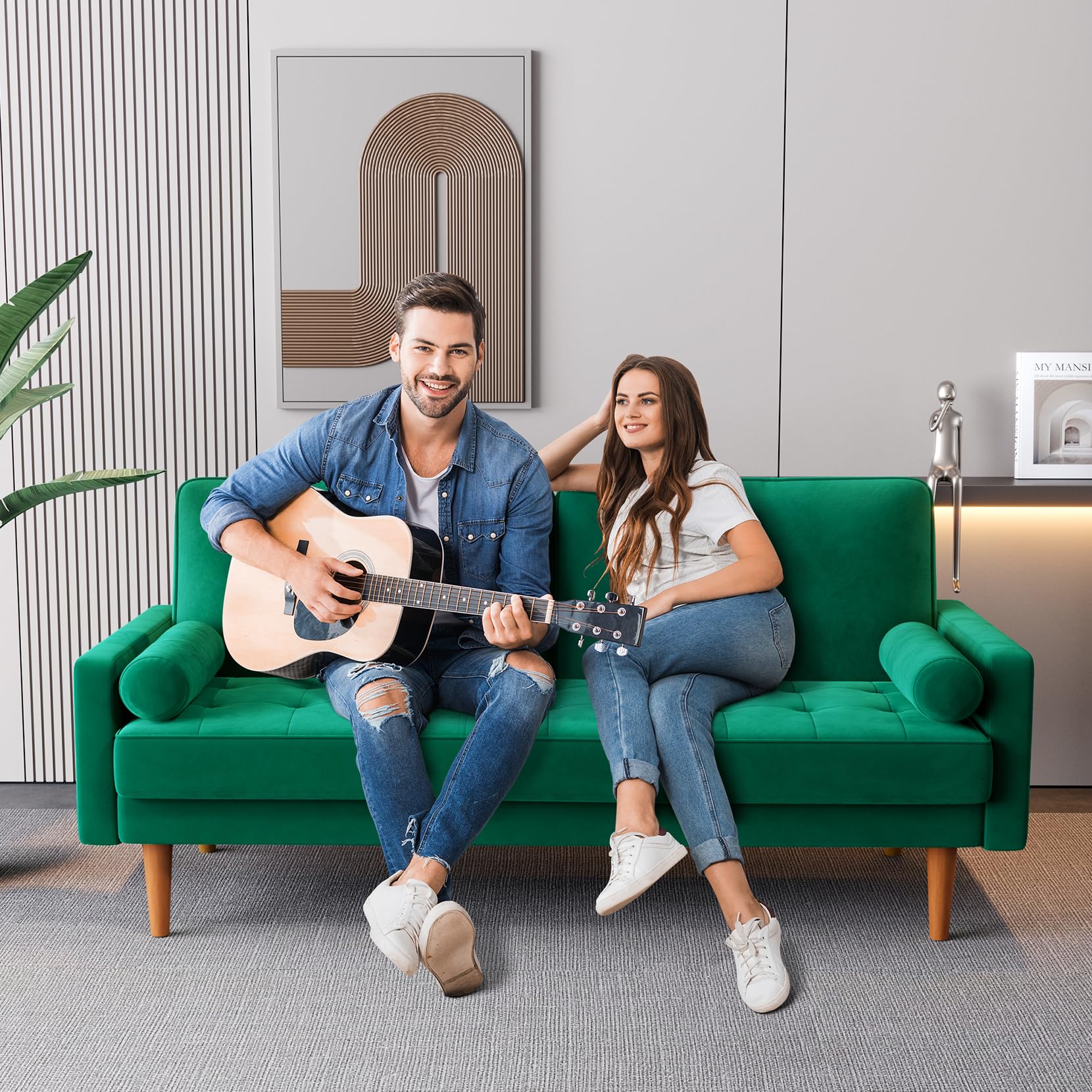 - Vesgantti green velvet sofa is a stunning culmination of comfortability and retro-charm. Classic, chic and minimalist, this cute loveseat sofa is designed with Mid-Centrury Modern Aesthetics, luxury green velvet, button tufted seat, bolster pillows and solid tapered wood legs, adding to its sleek profile. It definitely will be a lovely addition to your living space!