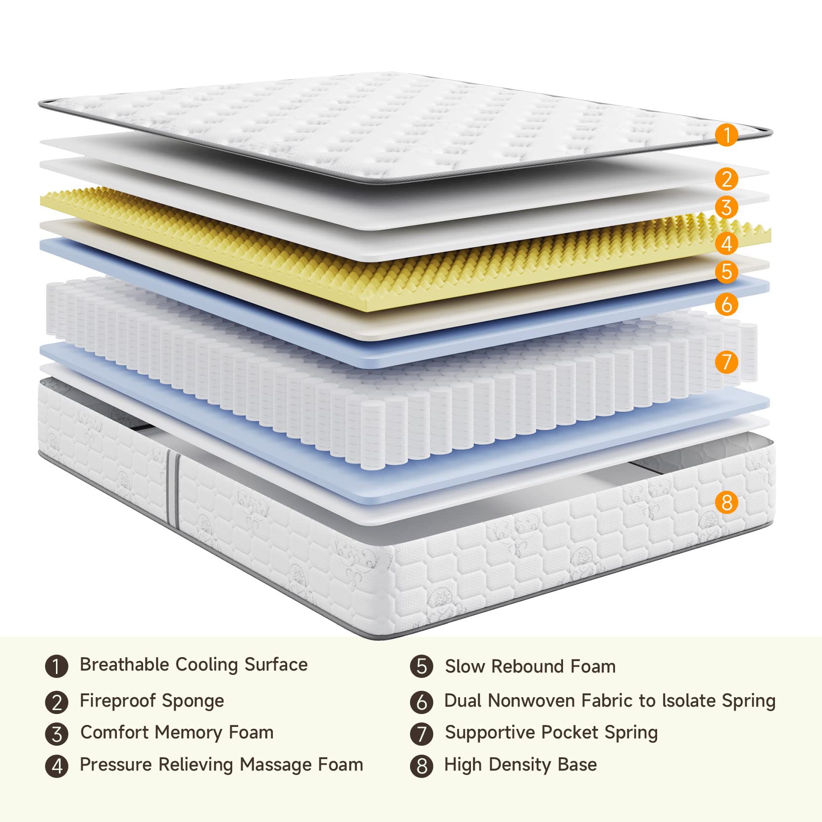 - Ultra Quiet- Due to the pocket spring + multilayer foams design, this mattress can effectively absorb noise and vibration; No waken up caused by tossing and turning, no disturbing companion.