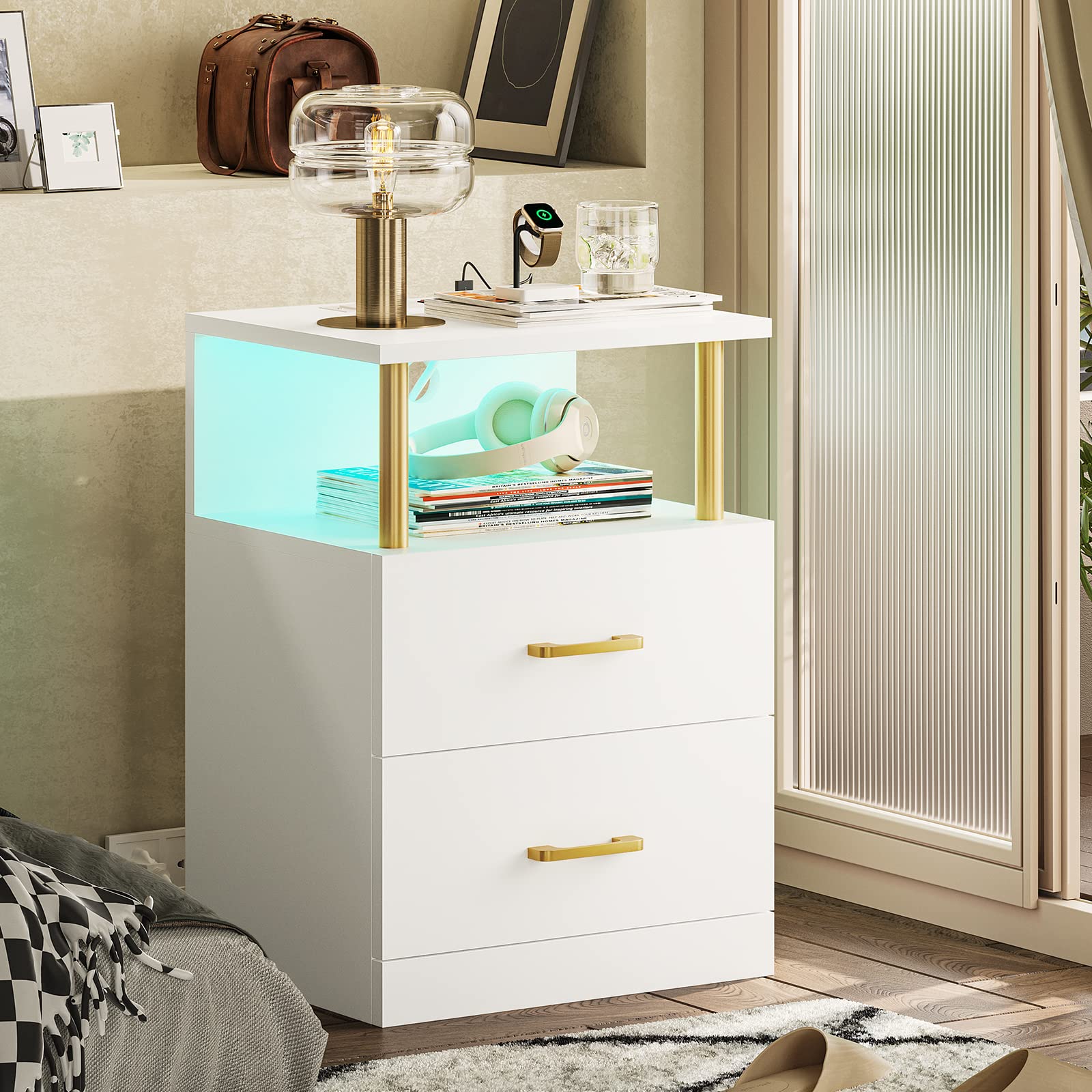 - This 23.6in tall white nightstand with 2 built-in drawers and easy-pull gold metal handle can go smoothly with the rails, providing enough space to organize your stuff and give you a neat space. The open storage shelf providing extra space for daily necessities, or simply display ornaments to style your room. Suitable for bedroom, living room, office, study room.