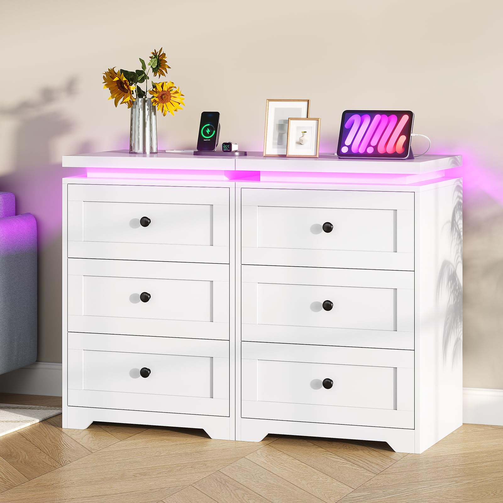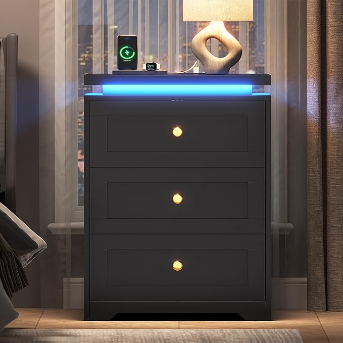 White Nightstand with Charging Station, Charging Nightstand with 3 Storage Drawers,