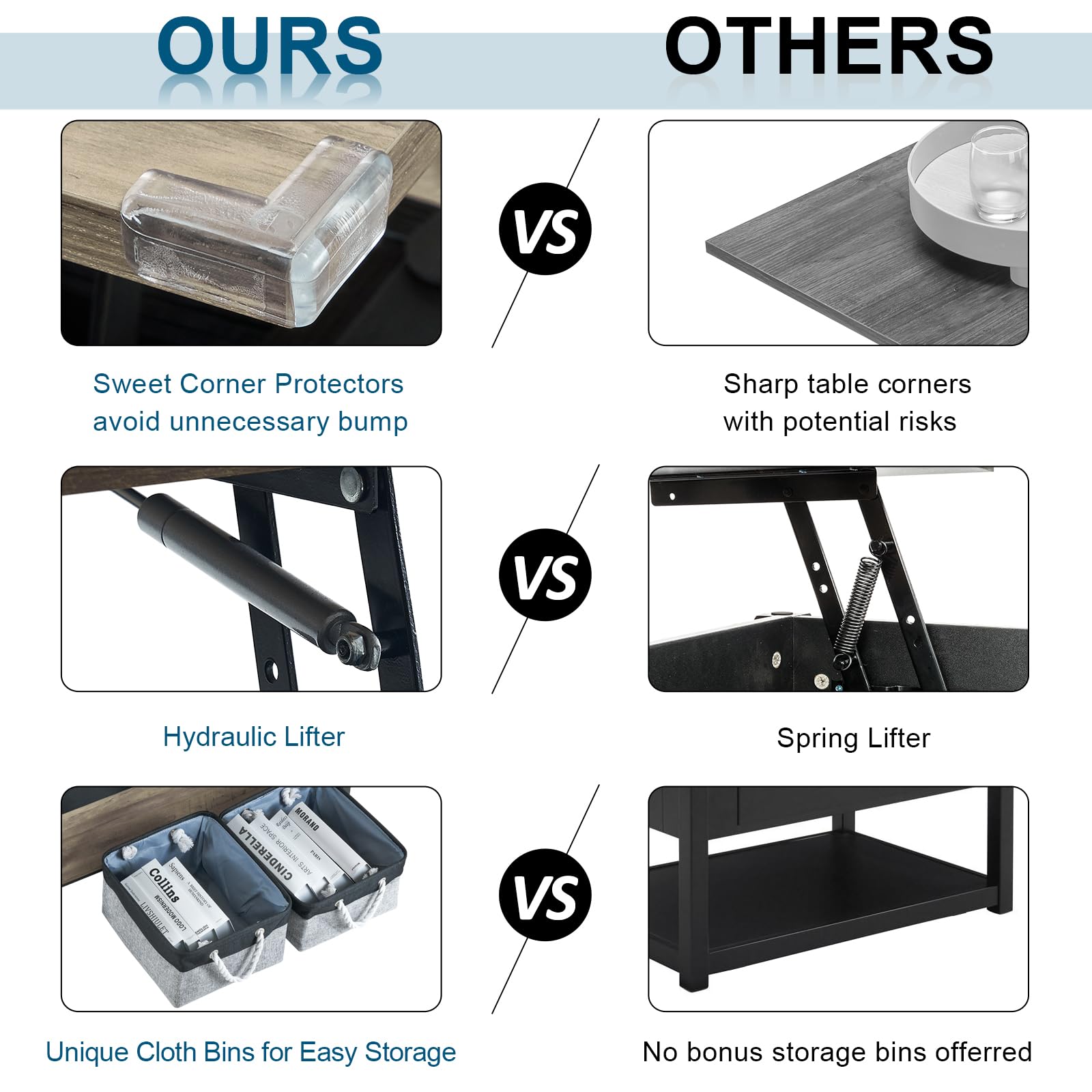 - 1. Shifting the spring lifter into a pre-assembled hydraulic mechanism saving the stretching installation hassle of springs; 2. Offer premium cloth storage bins together with the table for an added value ; 3. Extra corner protectors for better protection;
