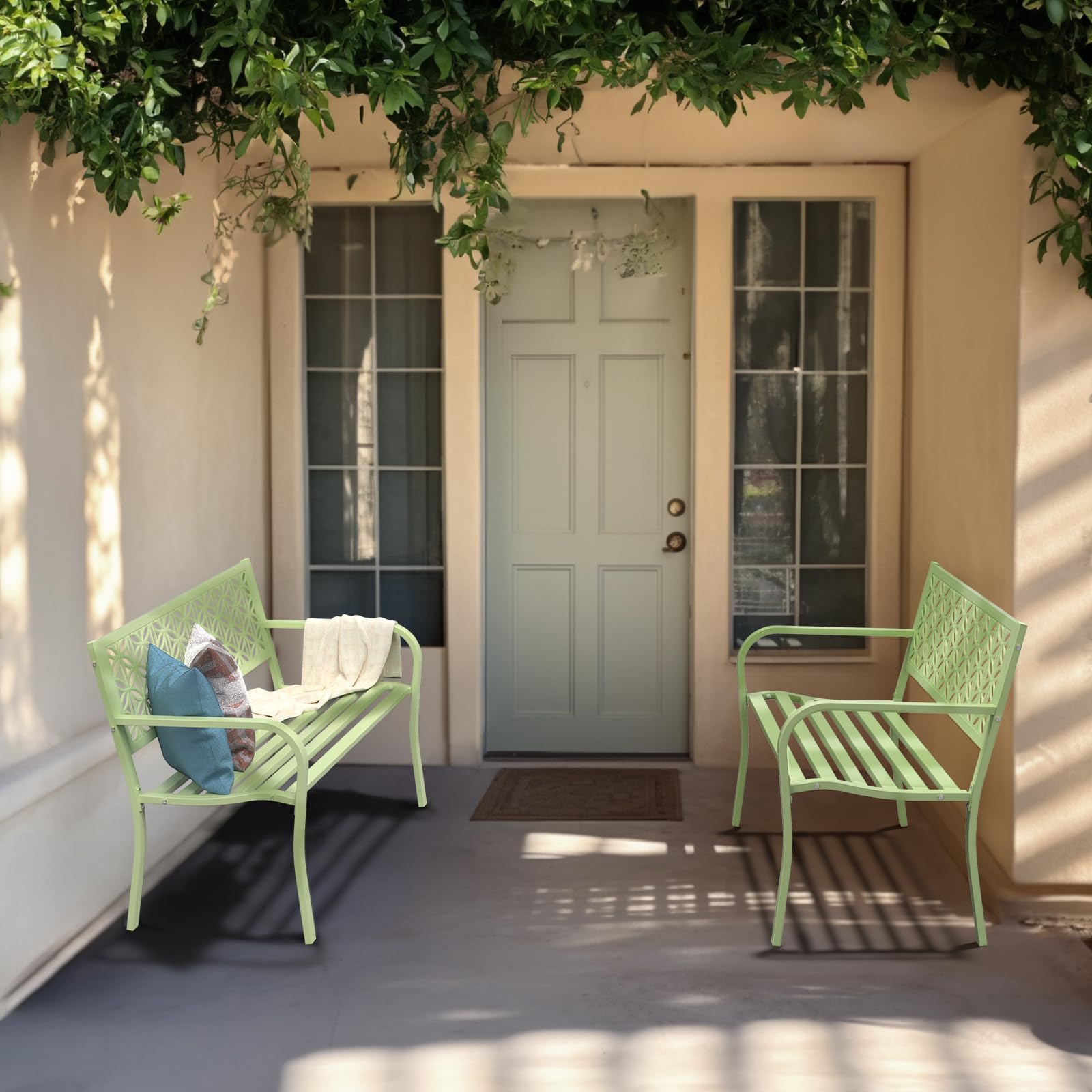 Outdoor Bench Metal with Floral Back, Garden Bench Front Porch Bench for Yard Patio