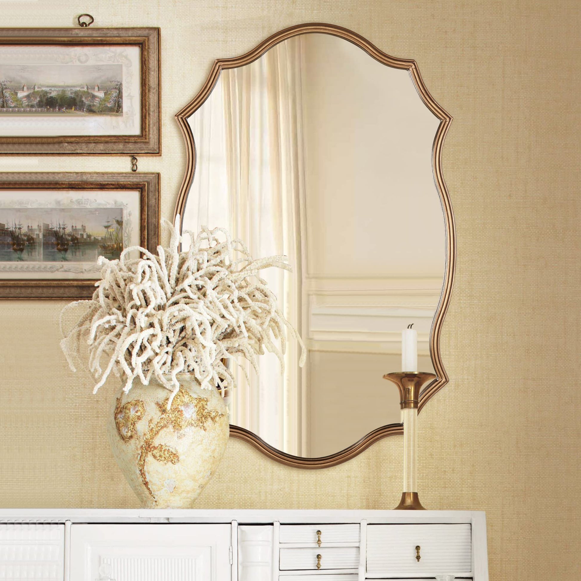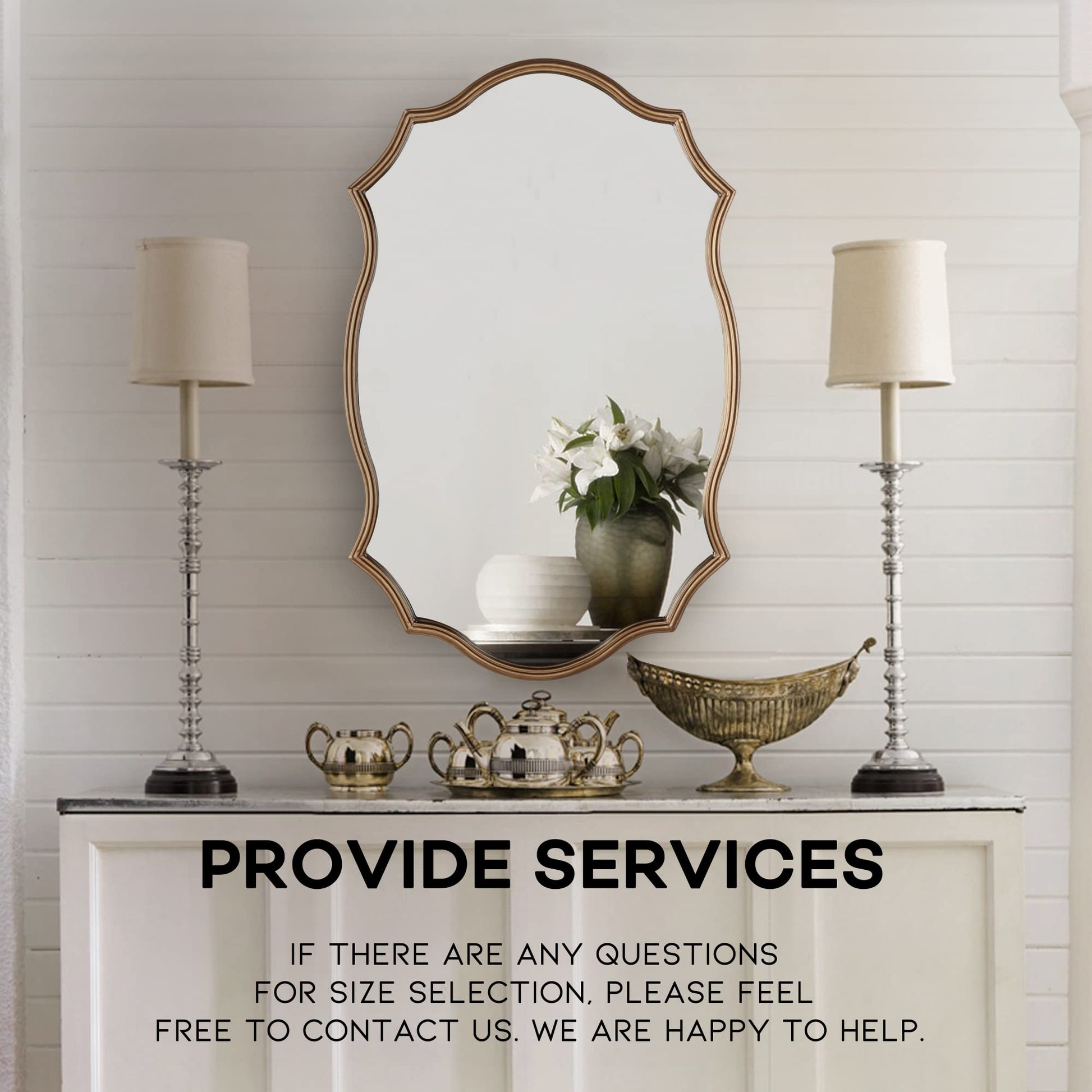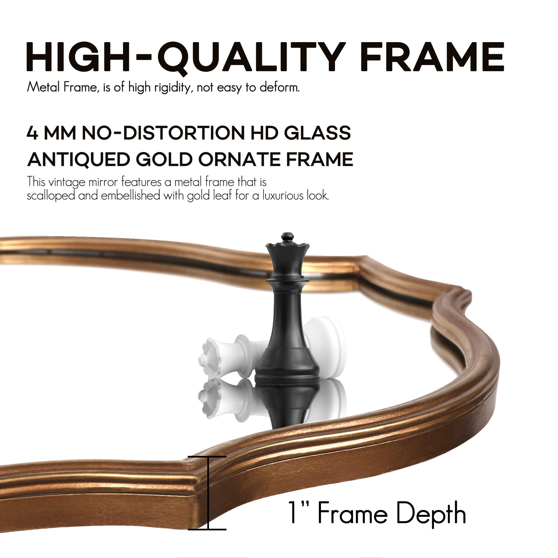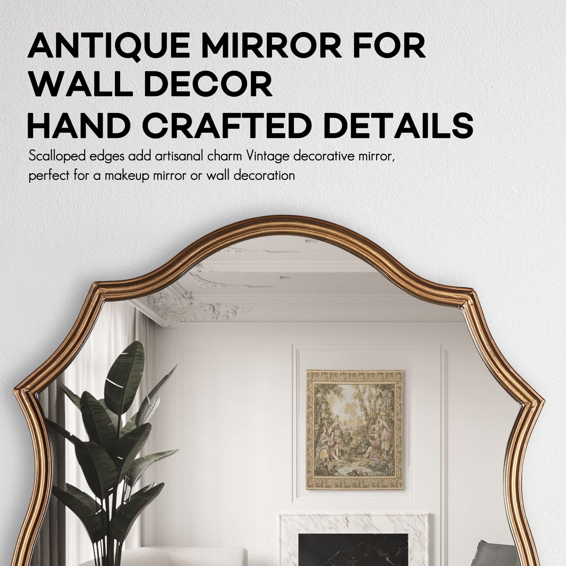 Elevate your space with this stunning vintage gold wall mirror, featuring an elegant antique brass metal frame that adds timeless sophistication to any room. The 20x30 inch size makes it perfect as an accent piece or vanity mirror.