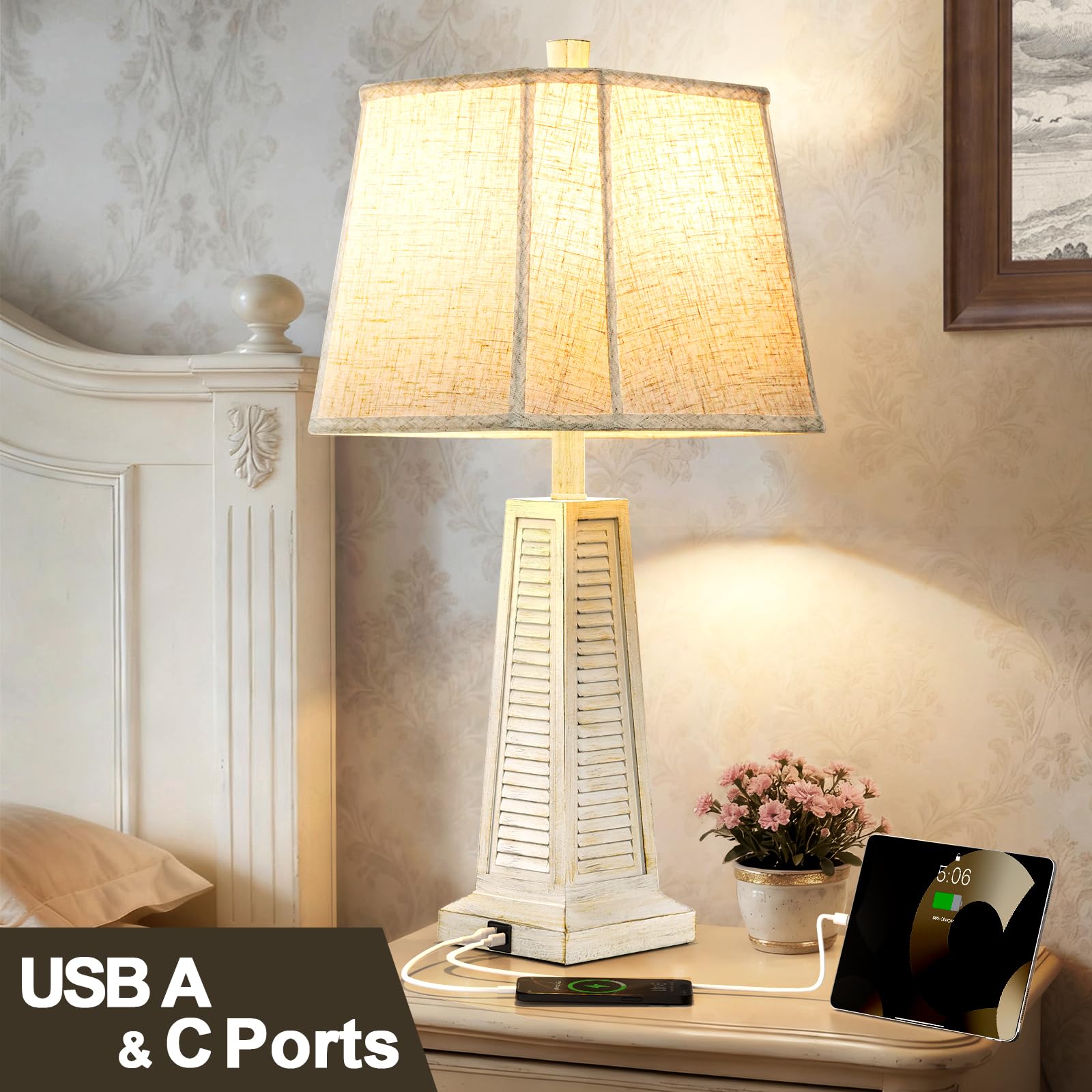 Elevate your living space with this beautifully crafted vintage table lamp that seamlessly blends timeless farmhouse charm with contemporary functionality. Featuring dual USB charging ports and a warm linen lampshade, this rustic nightstand lamp brings both ambiance and practicality to your bedroom, living room, or office.