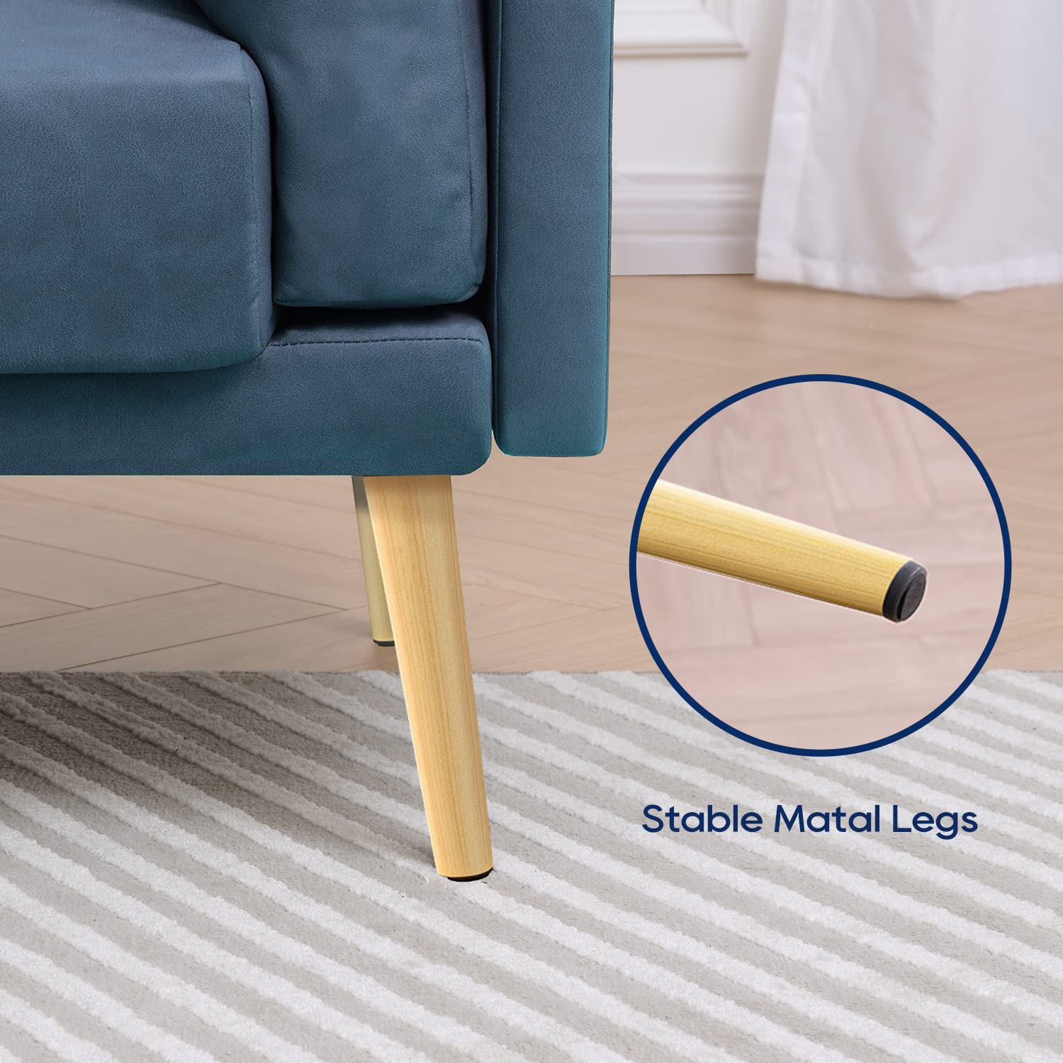 - EXQUISITE SOFA: Round full cushions match up the square board, wood grain metal legs match up the caramel brown faux leather, and every radian of the sofa is in careful measure, you would love it in first sight.