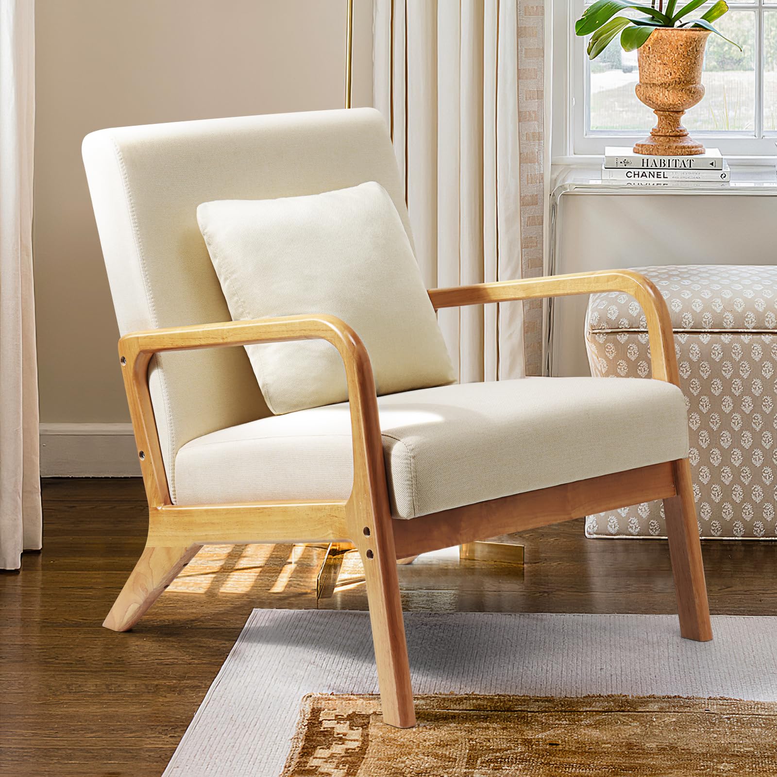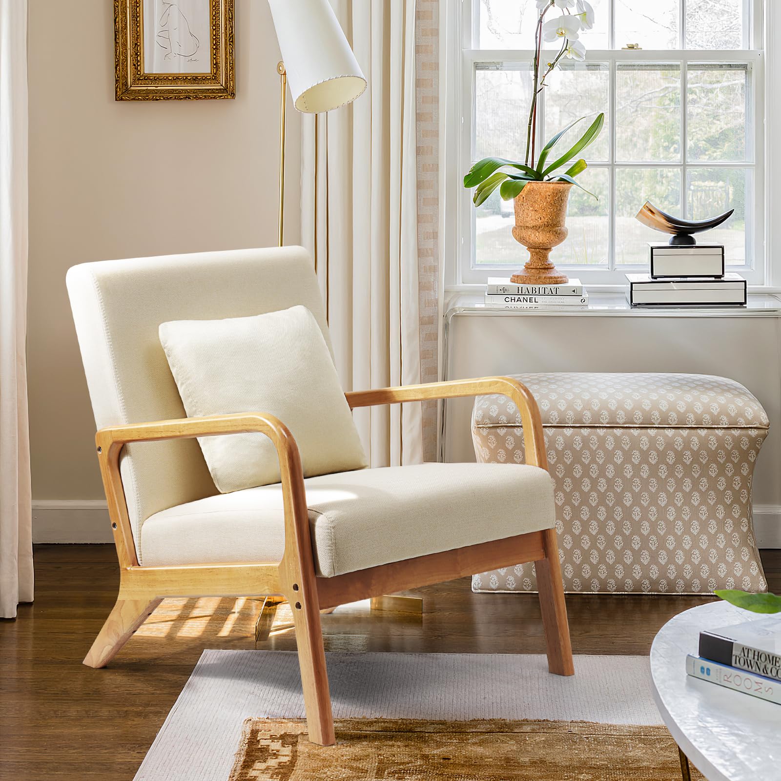 - Classic mid-century modern chair with arms, Mid-century accent chair with back and seat cushion,which could mesh well with your existing home décor and the overall practical design.You can use the chair as a piece of versatile furniture by moving around your home as needed, including living room, study room, or Firmly structured with solid wood as its legs and internal frame for added sturdiness and stability. Integral legs and armrests,Cushioned seat comfortably padded with high-density foam,When sitting on the living room chair, it is This living room chair comes in handy when you require a piece of functional and stylish furniture.You can sit on the armchais to read books,drink coffee,watch movies, play games and chat with friends