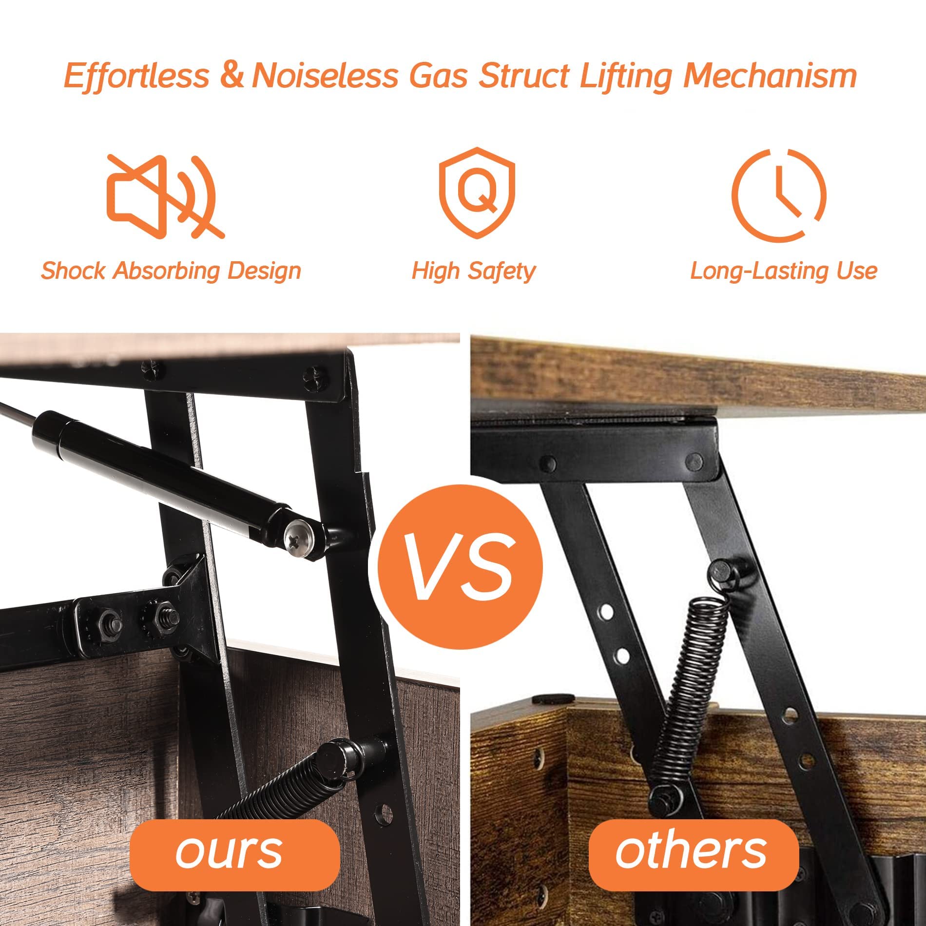 - The modern coffee table's innovative design with hidden compartment and lift tabletop can be adjusted vertically from 18.5"to 23.8" to meet your different demands of desired height and create a versatile working/eating surface. High quality mechanism enables the tabletop to be lifted up or lowered down effortlessly and noiselessly. And the stability will also be guaranteed while adjusting.
