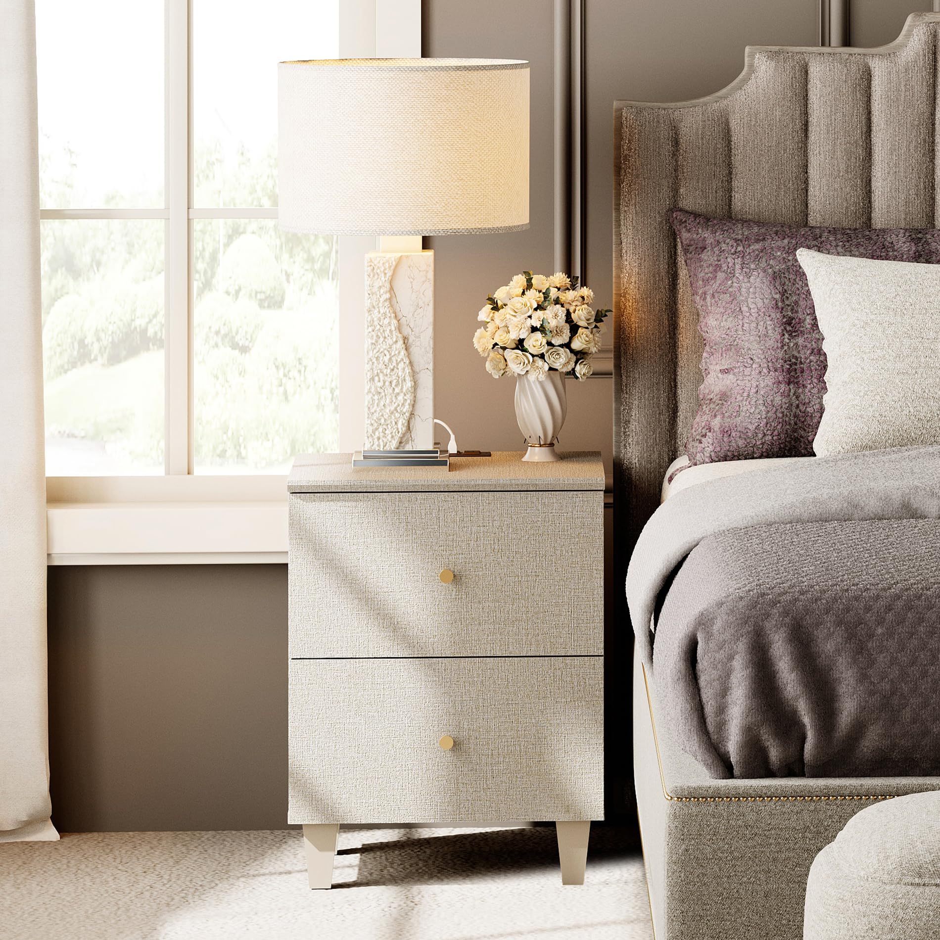 - Faux Linen Finish Design: This modern bedside table combines beige faux linen finish boards with gold metal knobs to create simplicity and stylish style, it matches well with various decors and will bring an elegant charm to the living room, bedroom, hallways and other small space