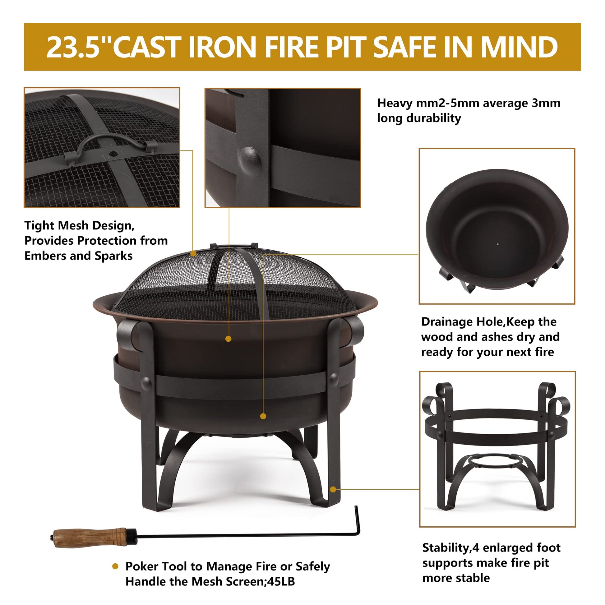 WeCooper Steel Cauldron Fire Pits, Outdoor Round Wood Burning Fire Pit Bowl with Mesh Screen,Fireplace Poker,23.5Inch