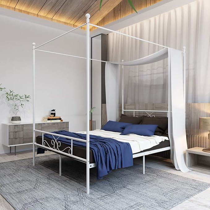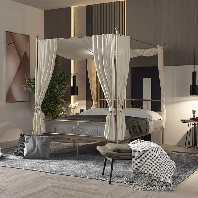 - Modern Canopy Bed: This bedframe stands out with clean full metal lines, elegance headboards. Minimalist design with four-posts and canopy top, allowing for customization with decorative curtains.