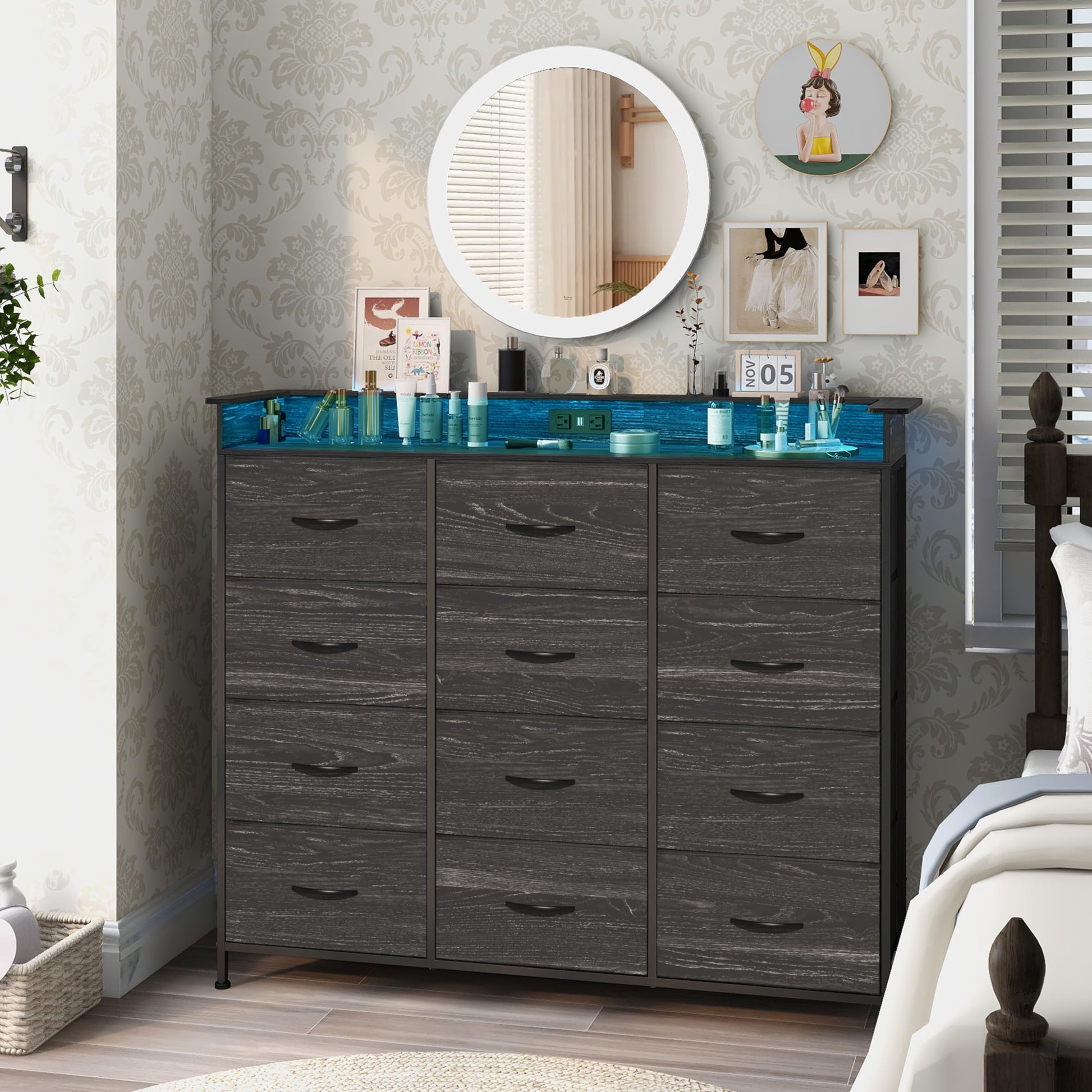- 12 Fabric Drawers, Ample StorageThe overall dimensions of the dresser are 49.52"(L) x 12.5"(W) x 41.5"(H), with 12 spacious drawers, each measuring L-14.88" x W-11.41" x H-8.54", you'll have plenty of room for all your essentials. The imitation wood grain leather fabric drawers with easy-pull handles not only offer practicality but also add a touch of fashion to your space.