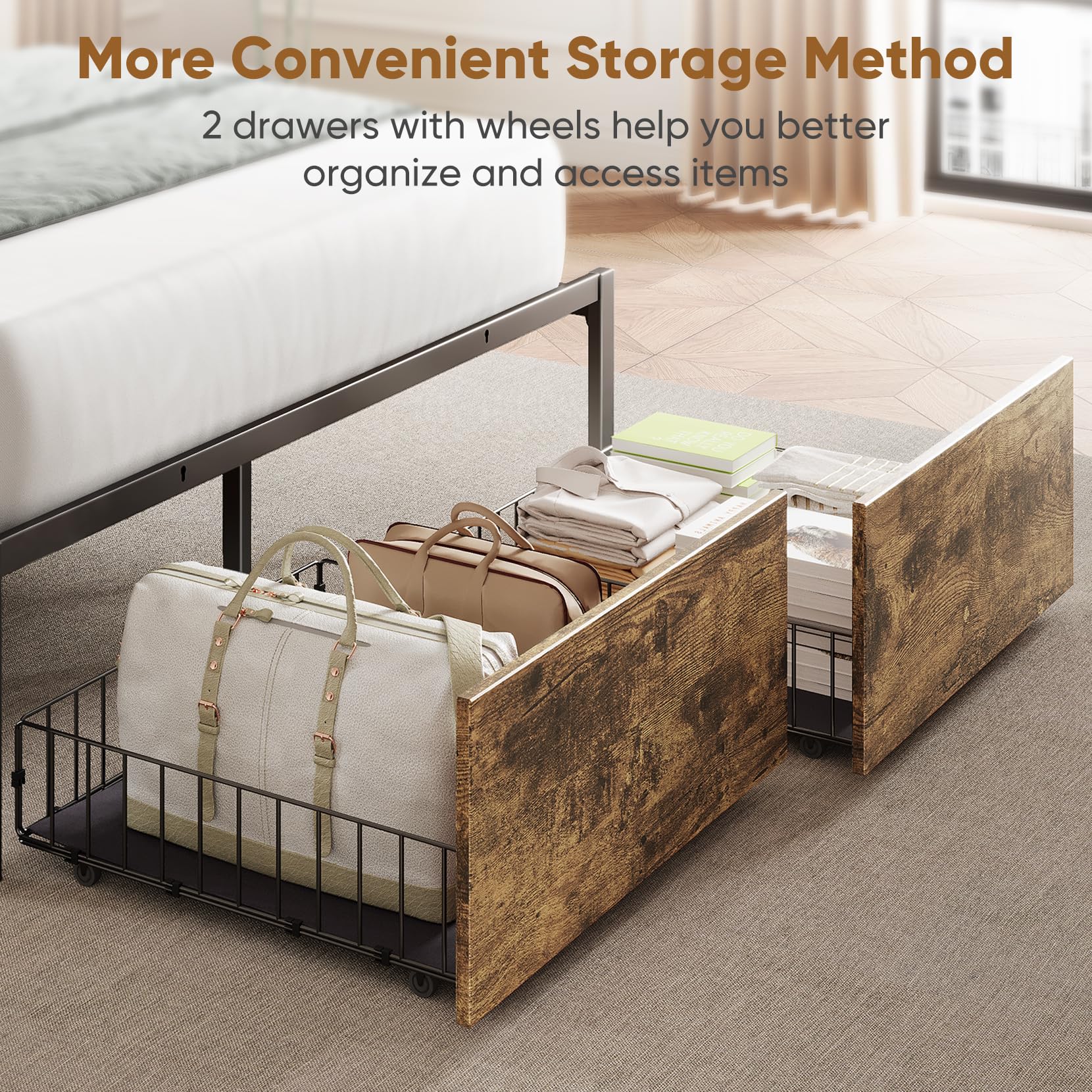 - Welzona bed frame features a charging station for added convenience when using your phone or tablet in bed. Additionally, there is ample storage space on the metal bed frame to keep your favorite small items within reach on the headboard. Finally, 2 storage drawers offer an expanded and cleaner storage area for your convenience