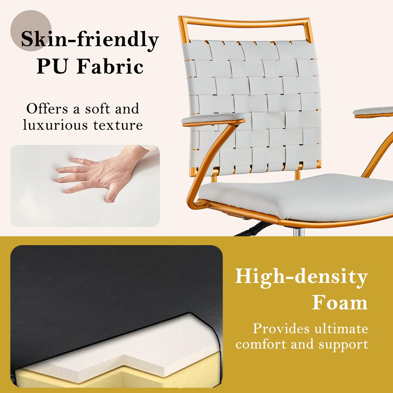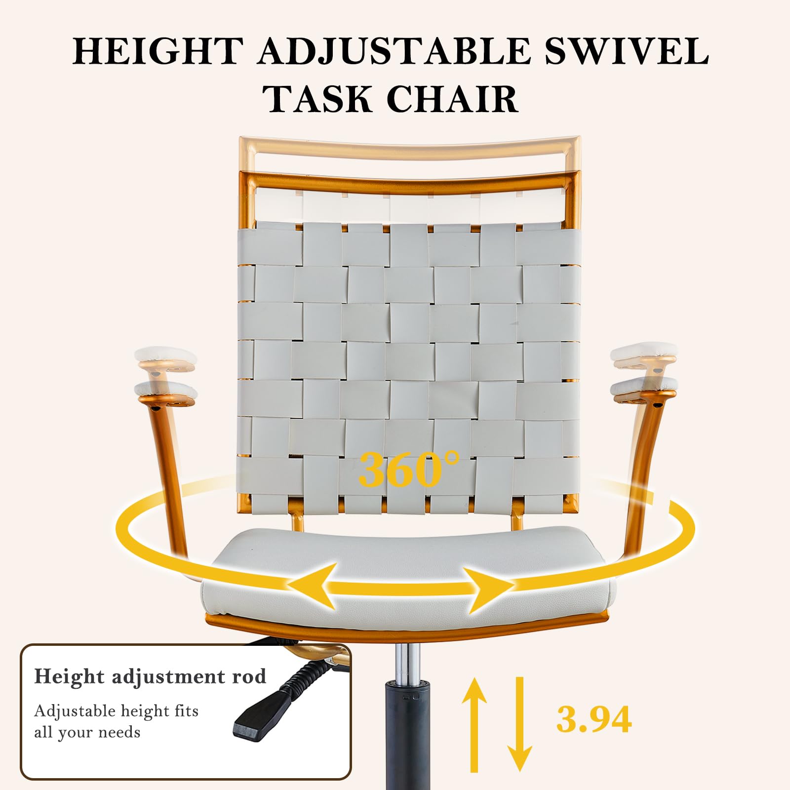 Elevate your workspace with this sophisticated office chair featuring elegant gold accents and premium white upholstery. Designed for both style and functionality, this adjustable swivel chair combines modern aesthetics with ergonomic comfort, making it the perfect addition to any home office, bedroom vanity, or professional workspace.