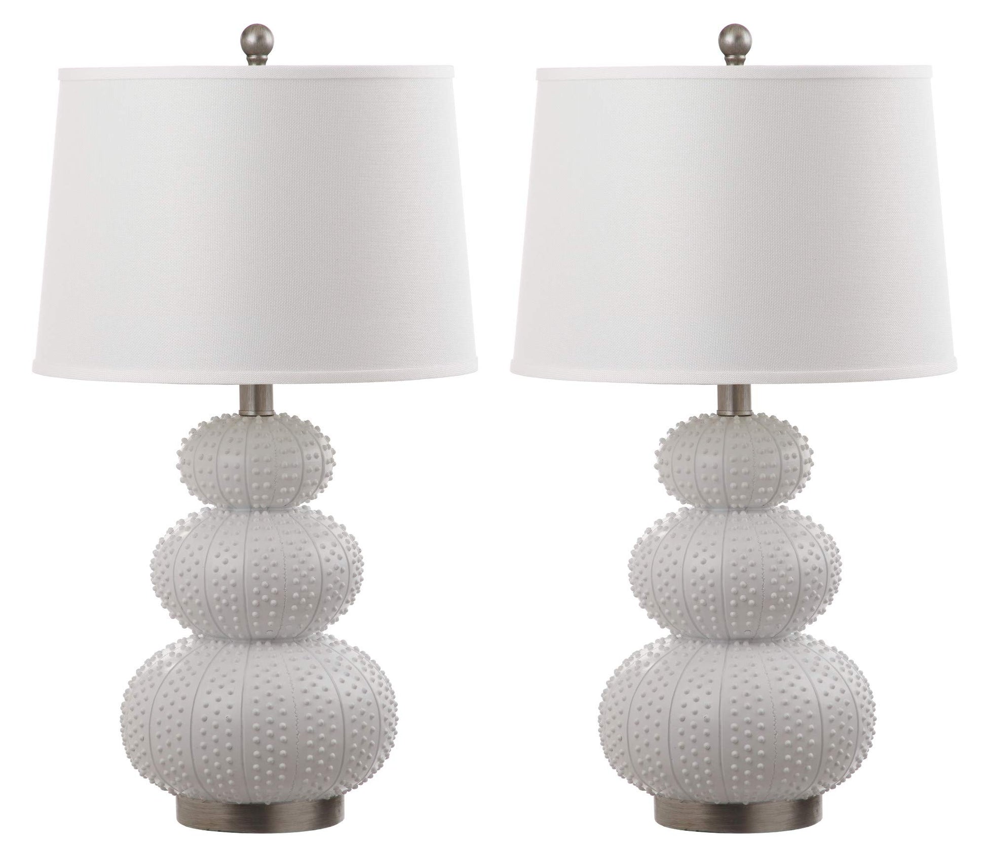 Elevate your interior with this sophisticated set of two table lamps featuring a distinctive triple gourd silhouette adorned with elegant studded detailing. The crisp white finish with antique silver accents brings timeless character to any space, while the off-white cotton shade provides warm, inviting illumination. Inspired by classic Hamptons design, these lamps seamlessly blend traditional craftsmanship with contemporary style.