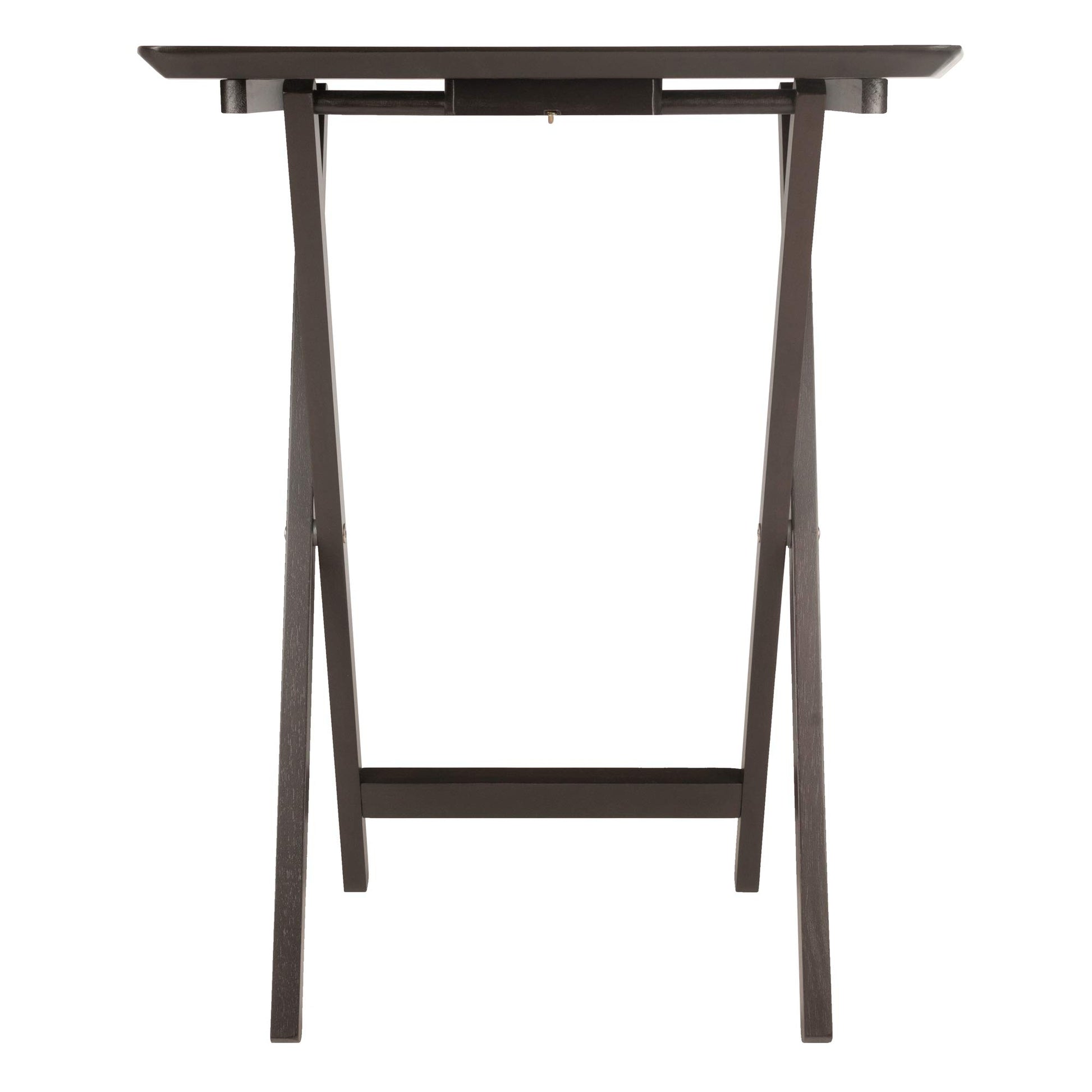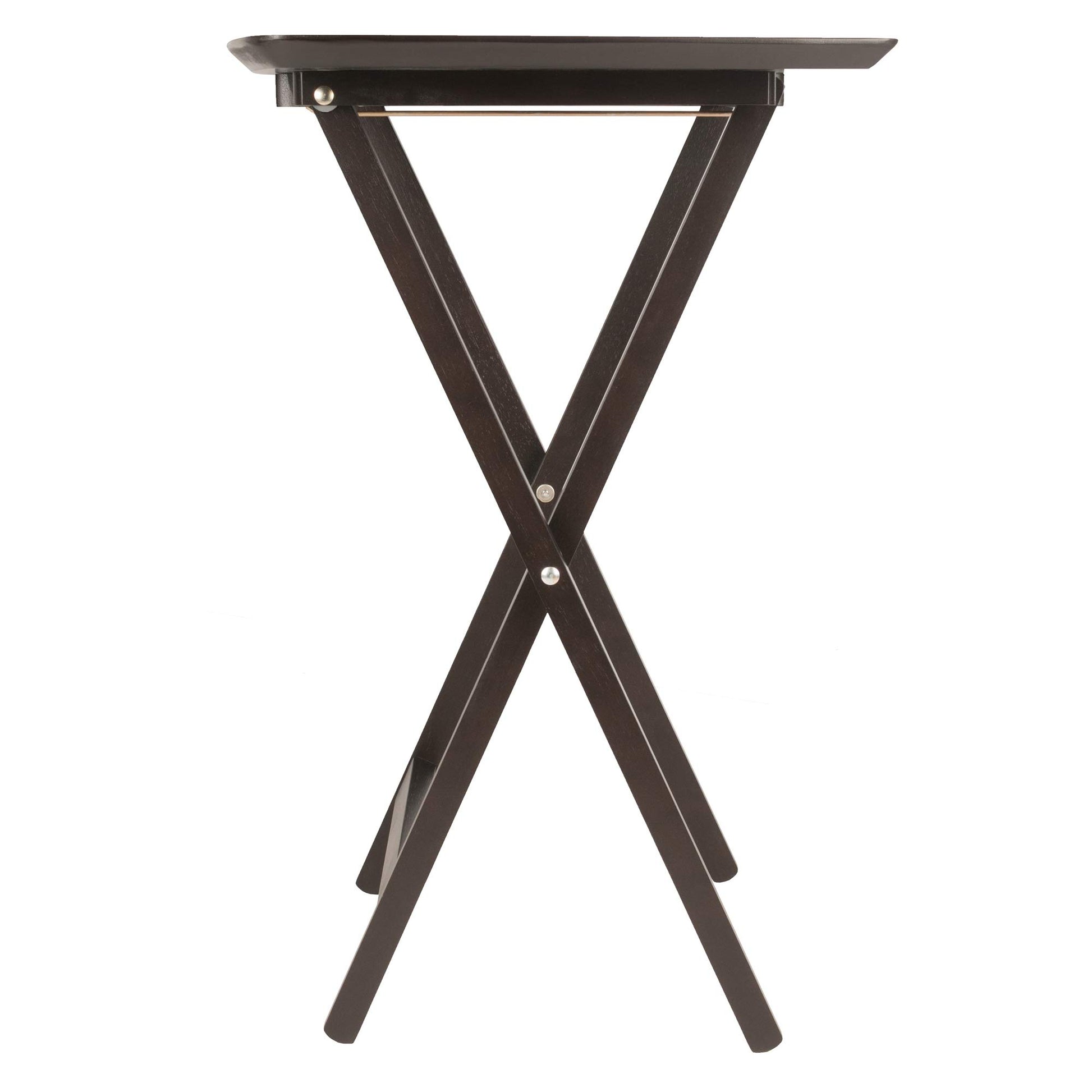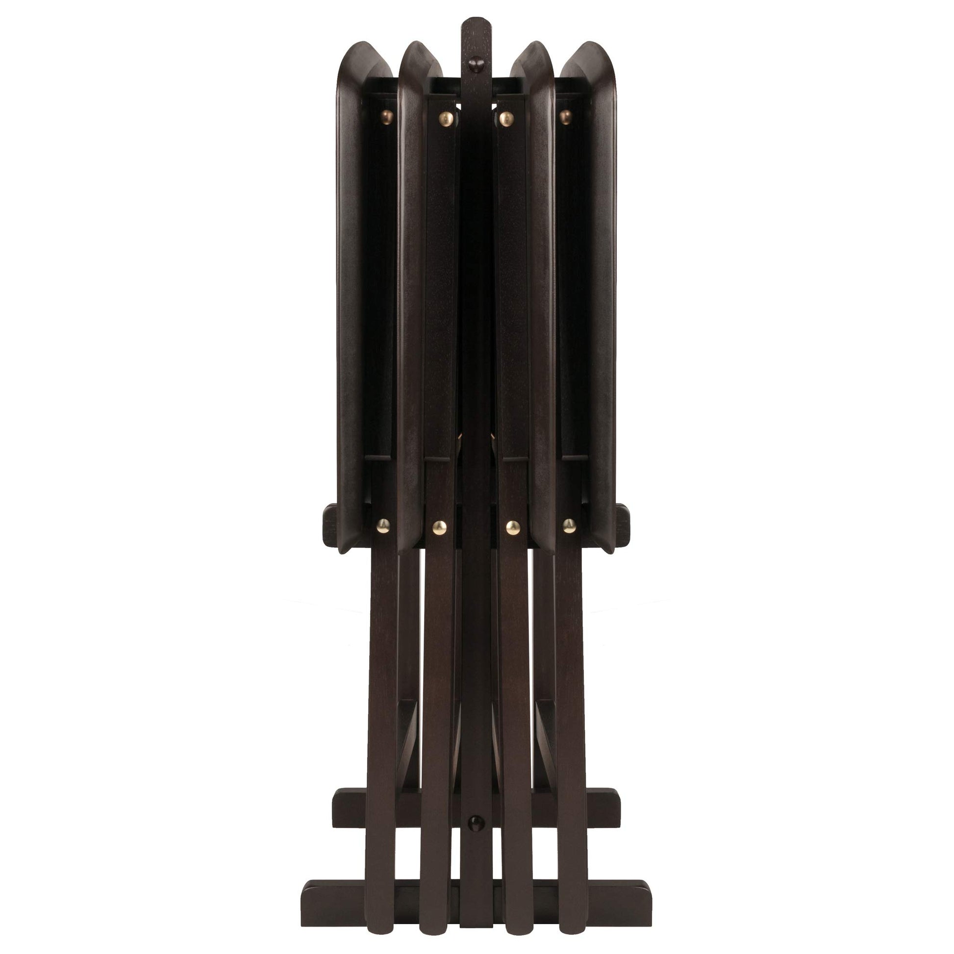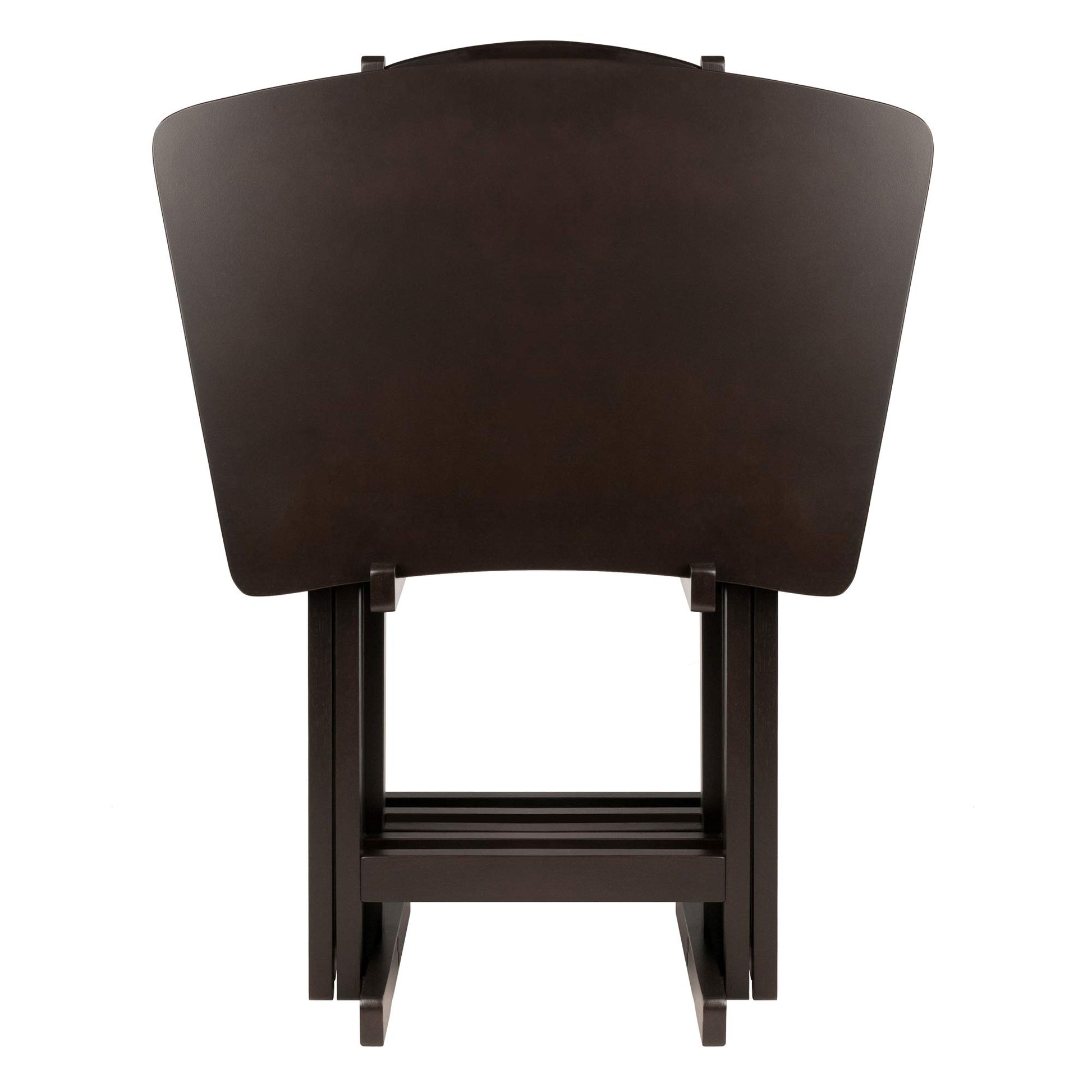 - Give yourself a little extra tabletop space with the Anila 5-piece Snack Table Set. The distinctive fan shape offers a longer arc that provides additional depth to the table and adds a lovely design element as well. Perfect for entertaining or a casual meal at home. The tables come fully assembled and store easily on the accompanying rack. Made of Solid and Composite wood in a deep Coffee finish.