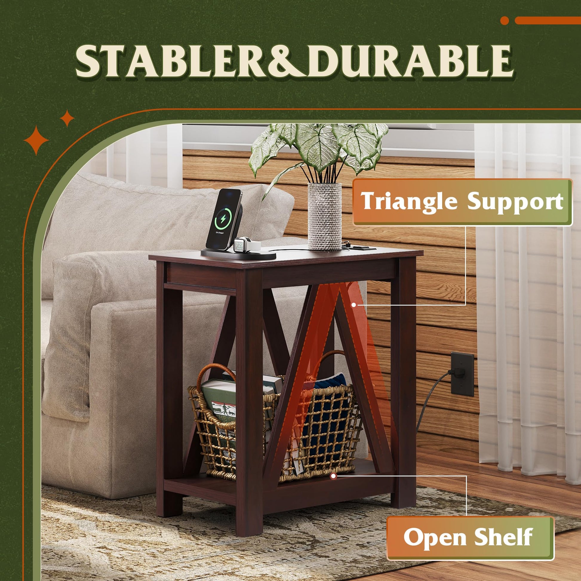 - Sturdy Structure and Intimate Design:The thick wood board and A-frame ensure stability and durability for years of use. Each leg of the side table is equipped with anti-slip pads, which will not scratch the floor. The weight capacity of the top is about 55 lbs, and the shelf is up to 44 lbs. This side table provides you with peace of mind.