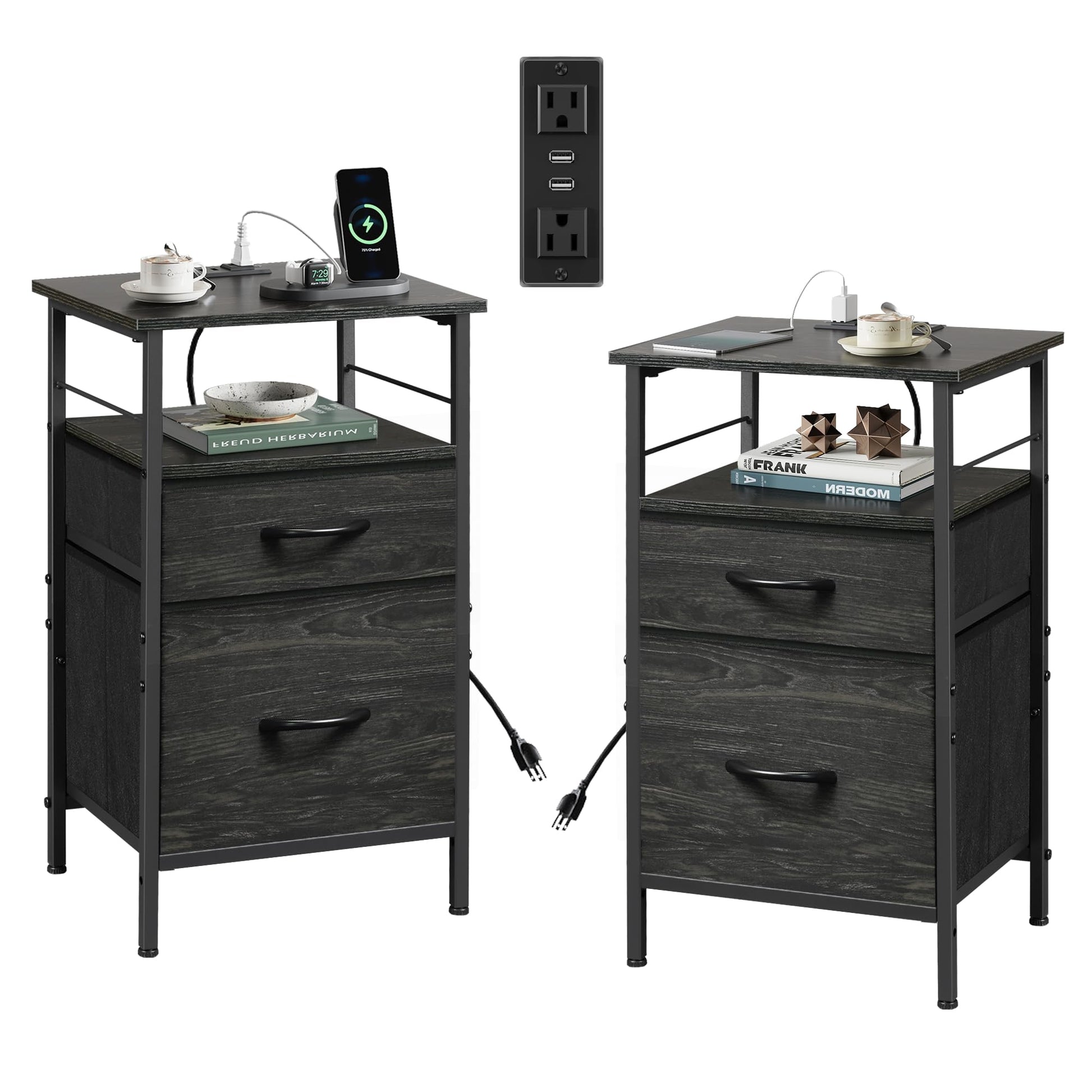 Night Stand Set 2, Black Nightstand with Charging Station, Bedside Tables for Bedroom