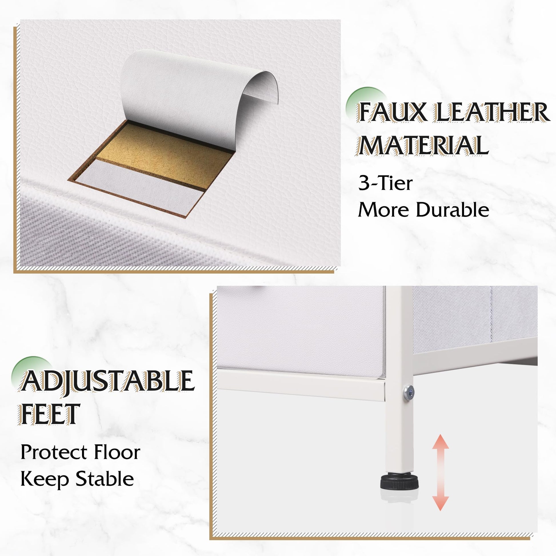 - Exquisite Design: Easy pull handles help open and close the drawers smoothly; 4 adjustable feet can protect your floor from scratches and are designed for uneven ground.