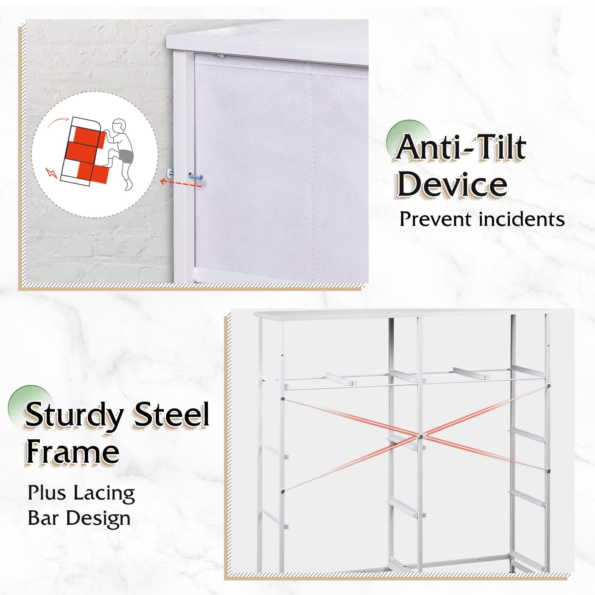 - Sturdy and Durable: The bedroom dresser can also be TV stand for small-size TV; With strong steel frame, water-resistant top and high-grade fabric drawers, the dresser is designed for a long service time.
