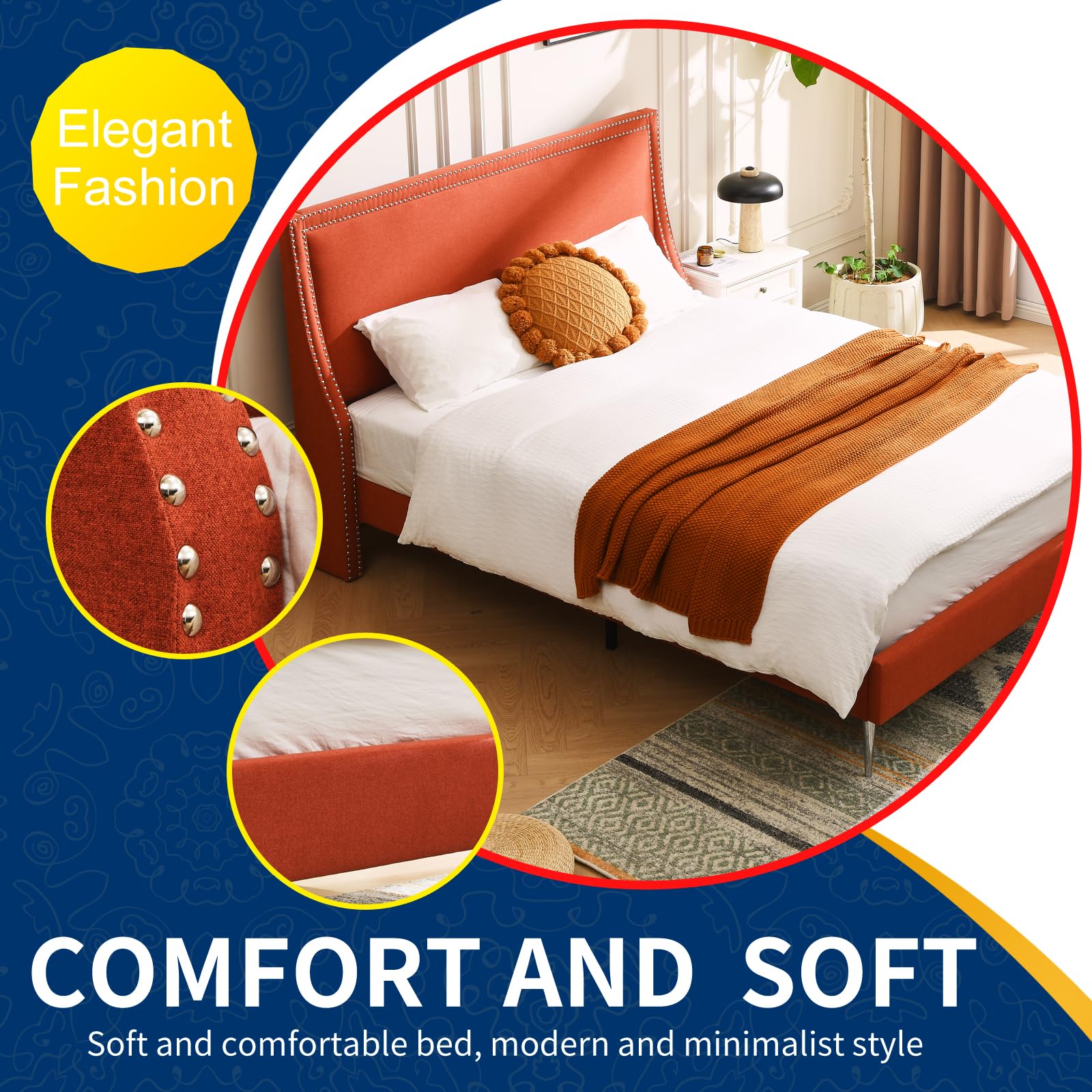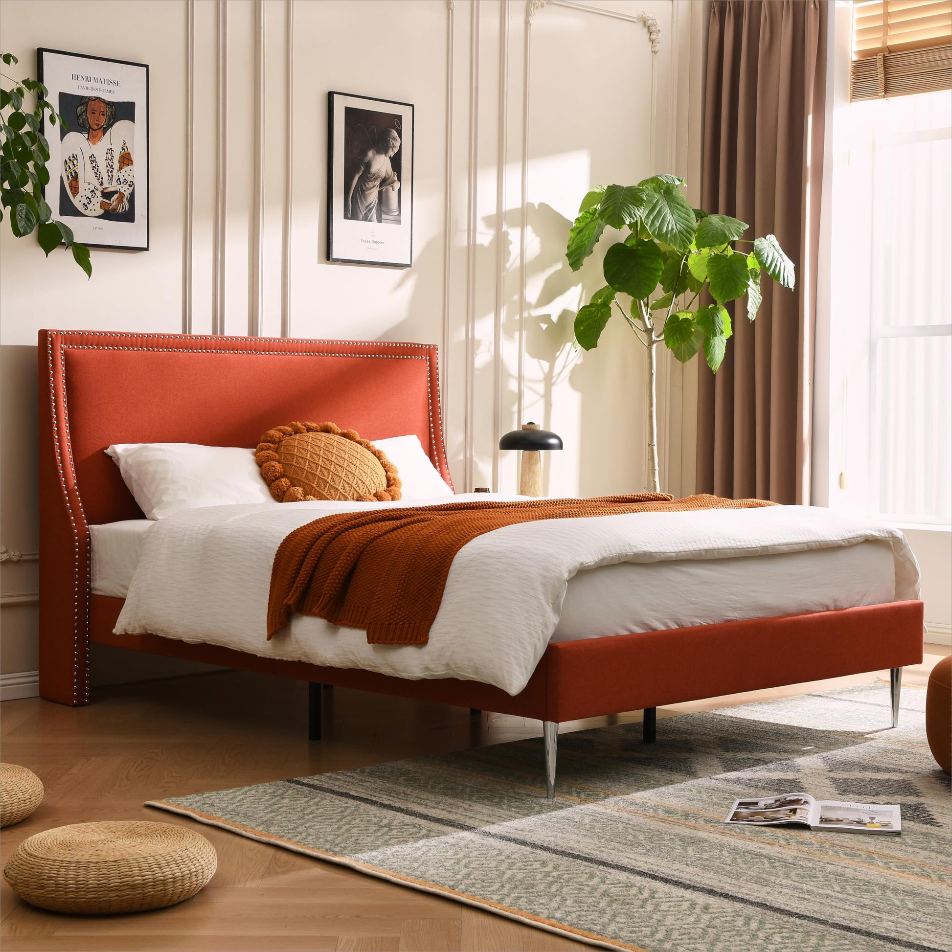 - Elegant and refined design The bed frame is covered with skin-friendly linen fabric, which makes you feel comfortable whenever your back is resting on it. The embellished metal studs make the bed frame unique and adorn a one-of-a-kind bedroom.