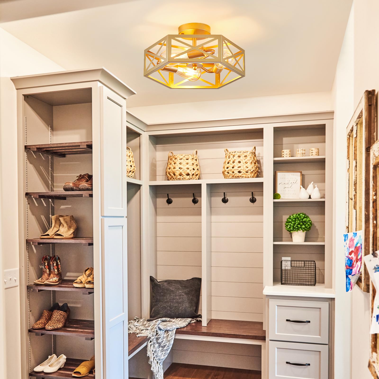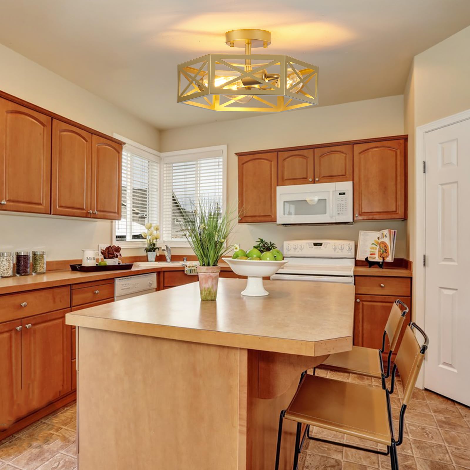 - The gold flush mount ceiling light fixture features a hexagonal metal cage in a gold finish, bringing a beautiful rustic, yet modern farmhouse appeal to its simple and stylish design. The open design and no glass allows the exposed bulbs to shine brightly, making it easier for you to change the bulbs.