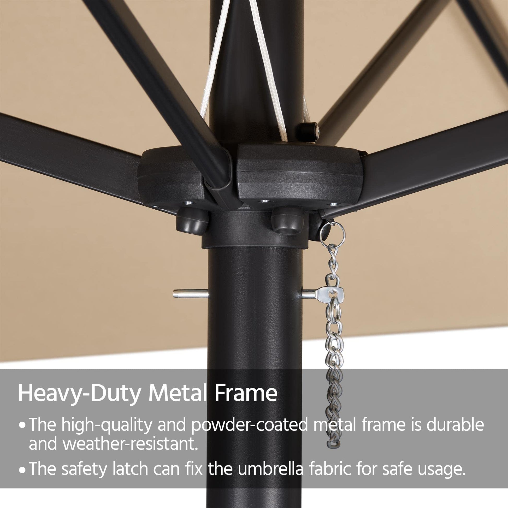 - Heavy-duty iron: This patio parasol is supported by 12 strong heavy-duty 1.2 cm (dia.) main ribs as well as a 4.8 cm (dia.) center pole, durable, stable, and safe to use.