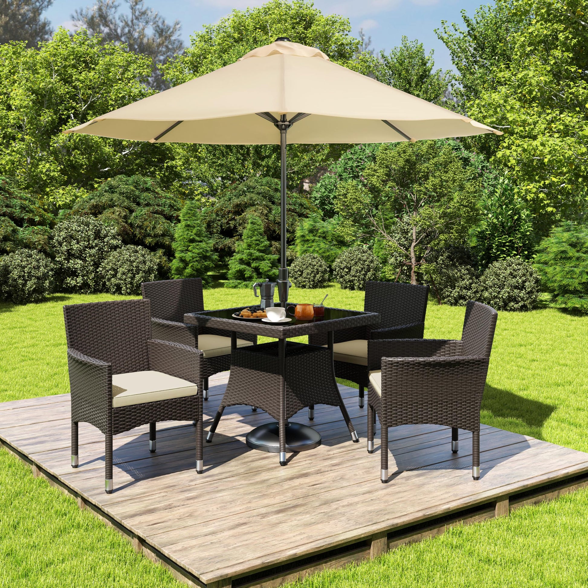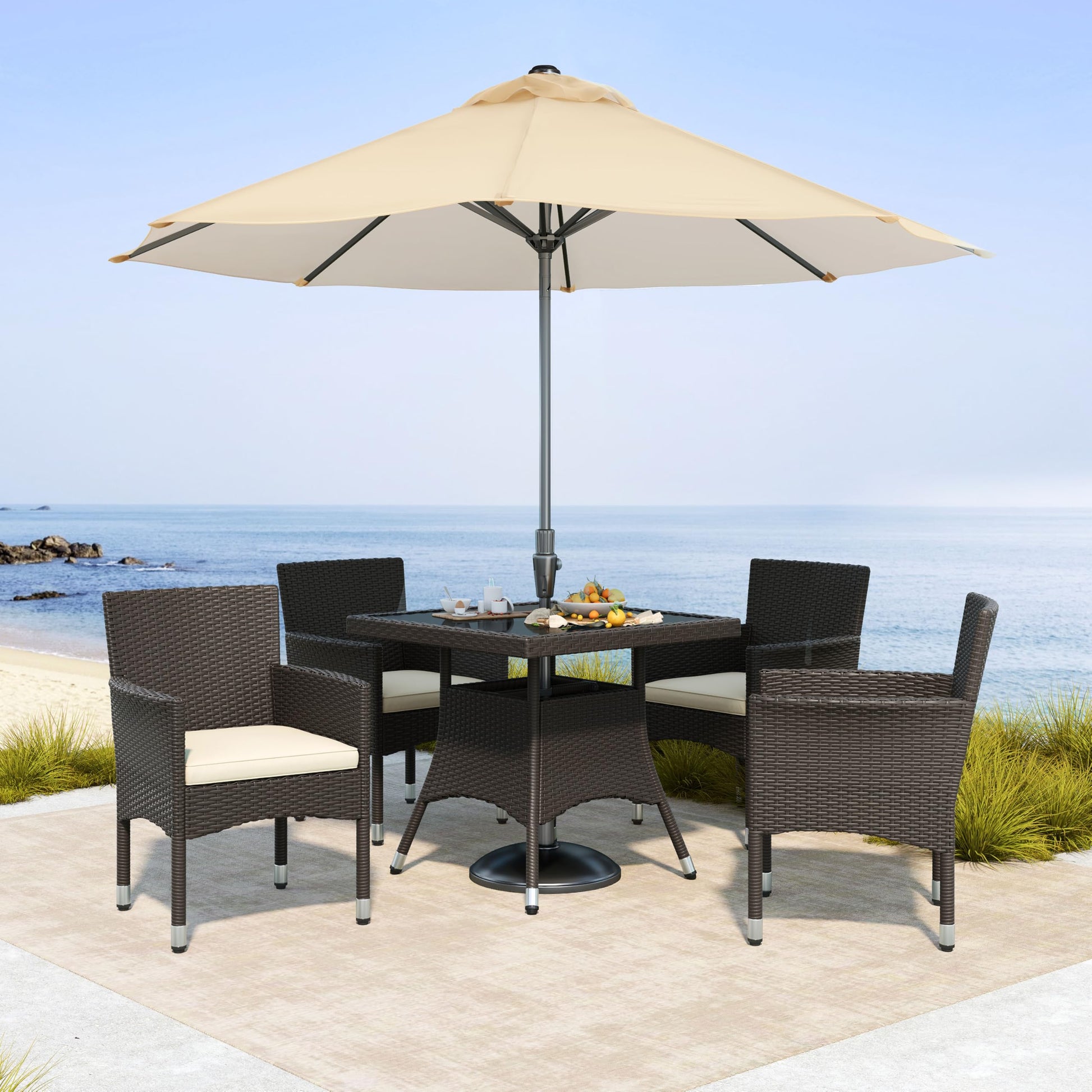- 5pcs Outdoor Dining Set: One dining table and four dining chairs are embraced by this 5pcs outdoor dining furniture set. This suite offers comfortable seating for up to four people to enjoy a chill outdoor afternoon tea or a romantic sunset dinner in the garden or courtyard