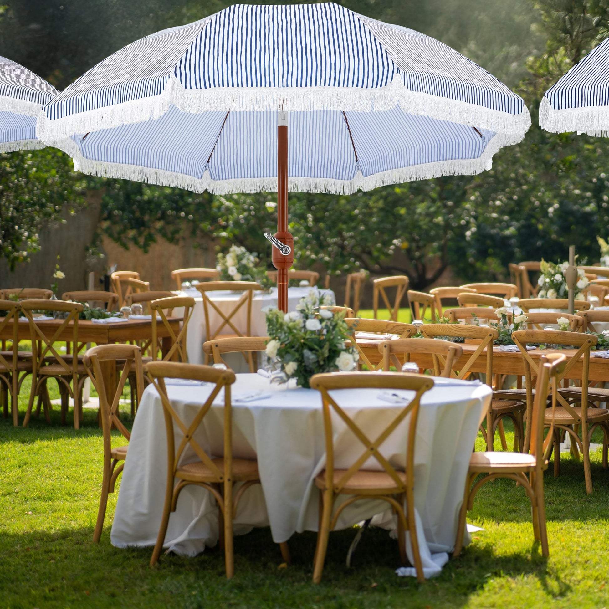 - Elegant and Delicate: Showcasing a round dome-shaped design, this 9ft garden parasol comes in romantic cream or fresh blue and white pinstripes, beautifully accented with pure white tassels. It adds a serene, romantic flair to your outdoor living space, creating a stylish and welcoming atmosphere