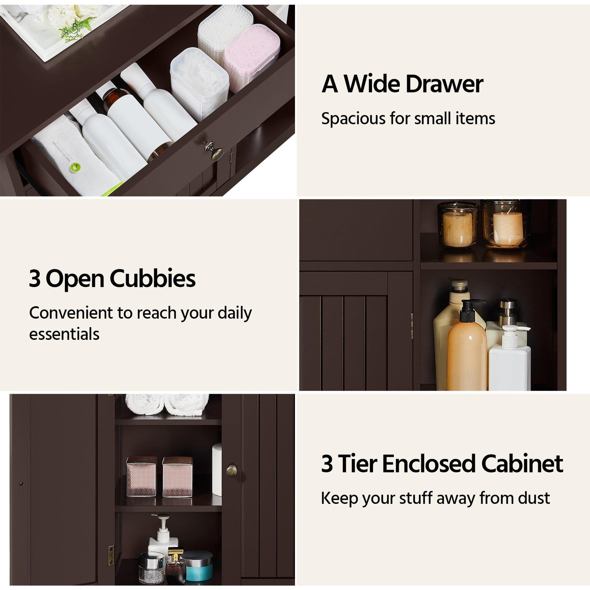 - This multi-level cabinet comes with a drawer and plenty of shelf space, bringing you a tidy and clean bathroom. It’s ideal for storing and organizing toilet paper, The side cabinet is well painted for moisture-resistant and long-wearing features. Cleaning will be a breeze you only need to clean it with a dry cloth.
