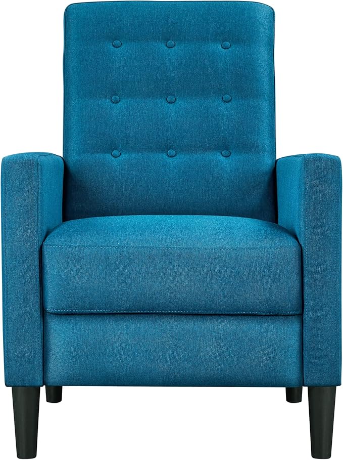 - Compact Size For Small Spaces: With an assembled size of 26.5″ W × 32″ D × 40.5″ H, this modern fabric recliner fits easily in narrow nooks and small spaces like bedrooms, game rooms, small living rooms and more.