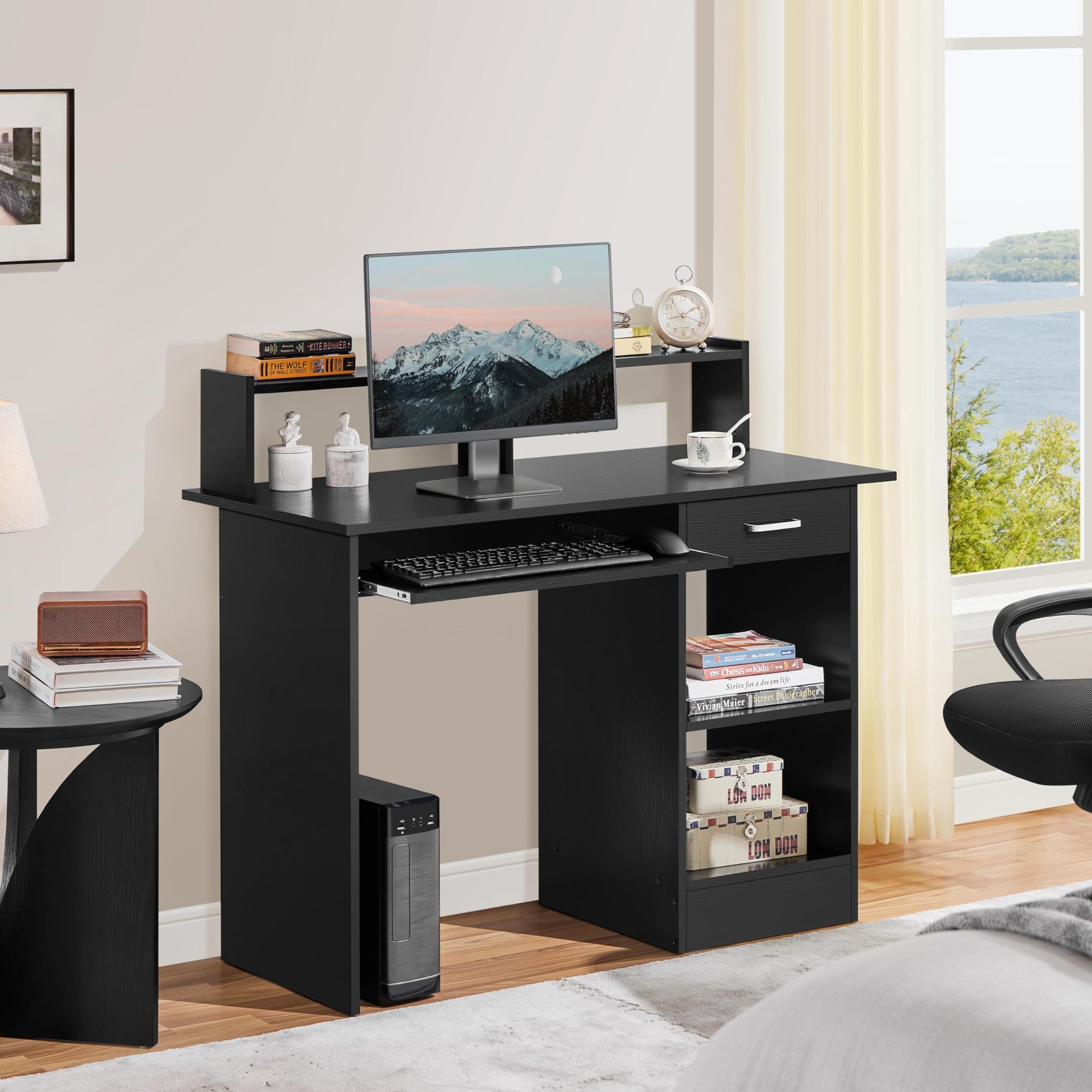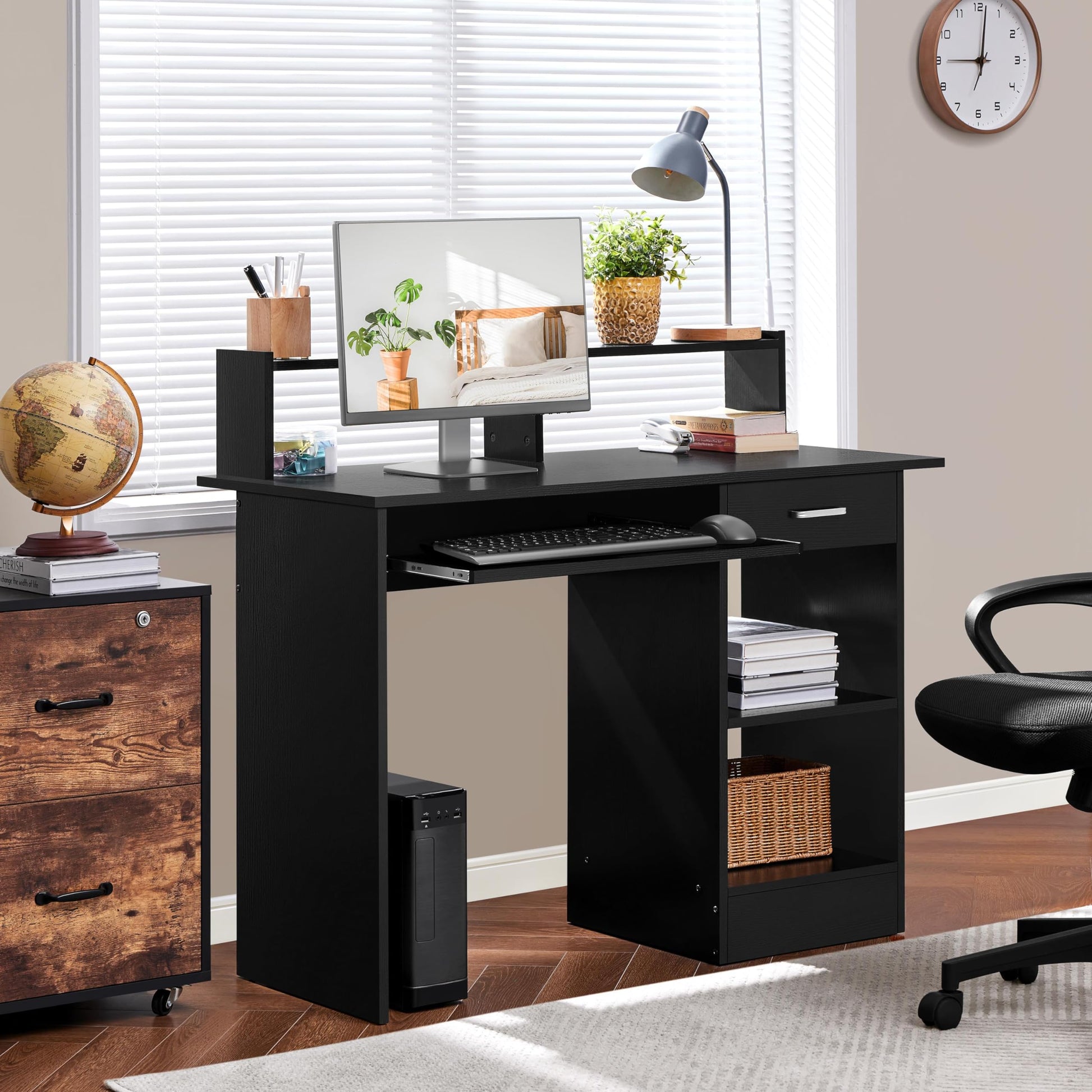 - Compact Home Workstation: The home office desk features a spacious working surface, a full-width top shelf, a smooth-sliding keyboard tray, a pull-out drawer and a roomy open cabinet with a height-adjustable shelf to meet your home office workstation needs.