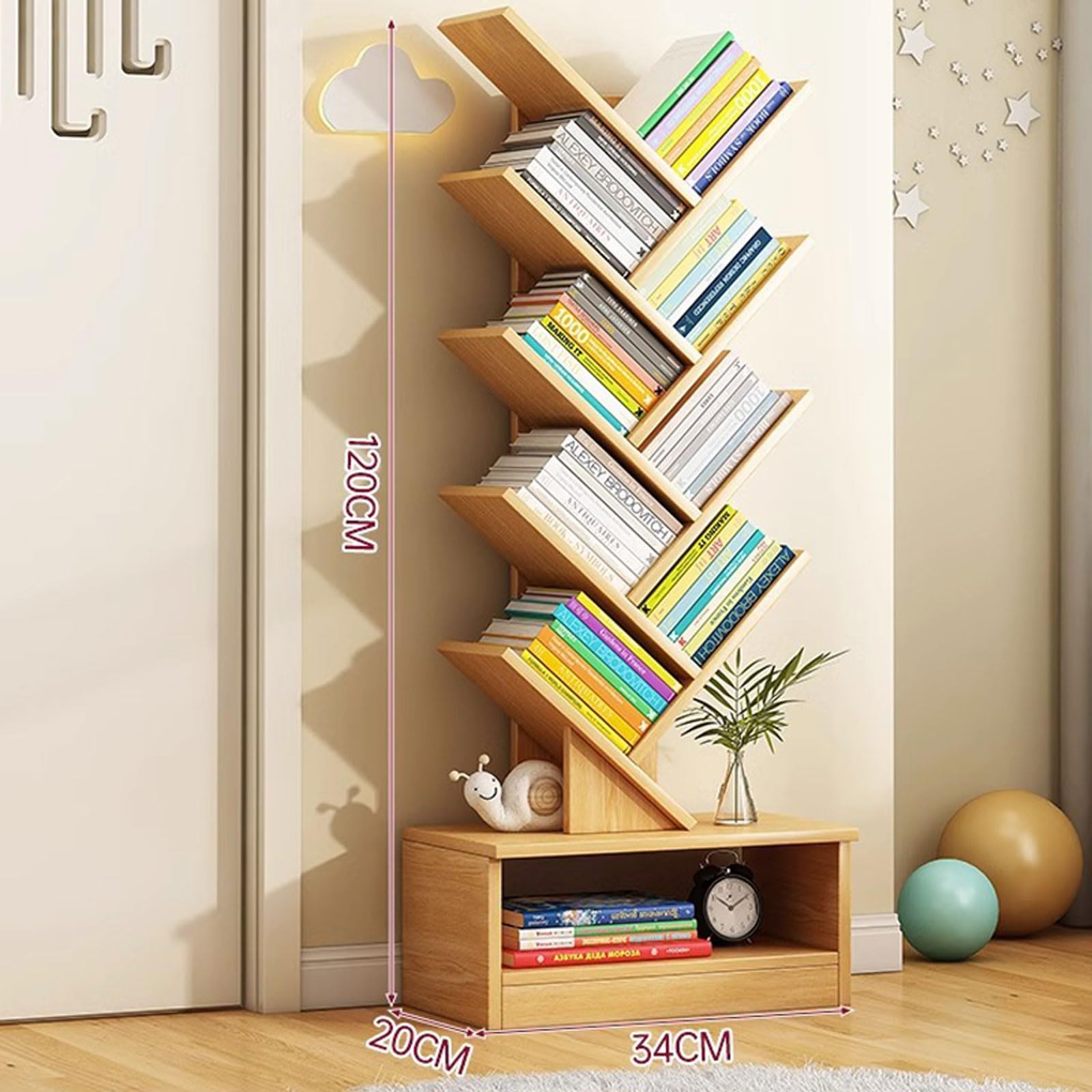 Details: Tree-Shaped Bookshelf, 8/10/12/14 Tier Floor Standing Wooden Bookcase with Cabinet , Storage Display Book Rack Shelving Unit for Living Room Study Office