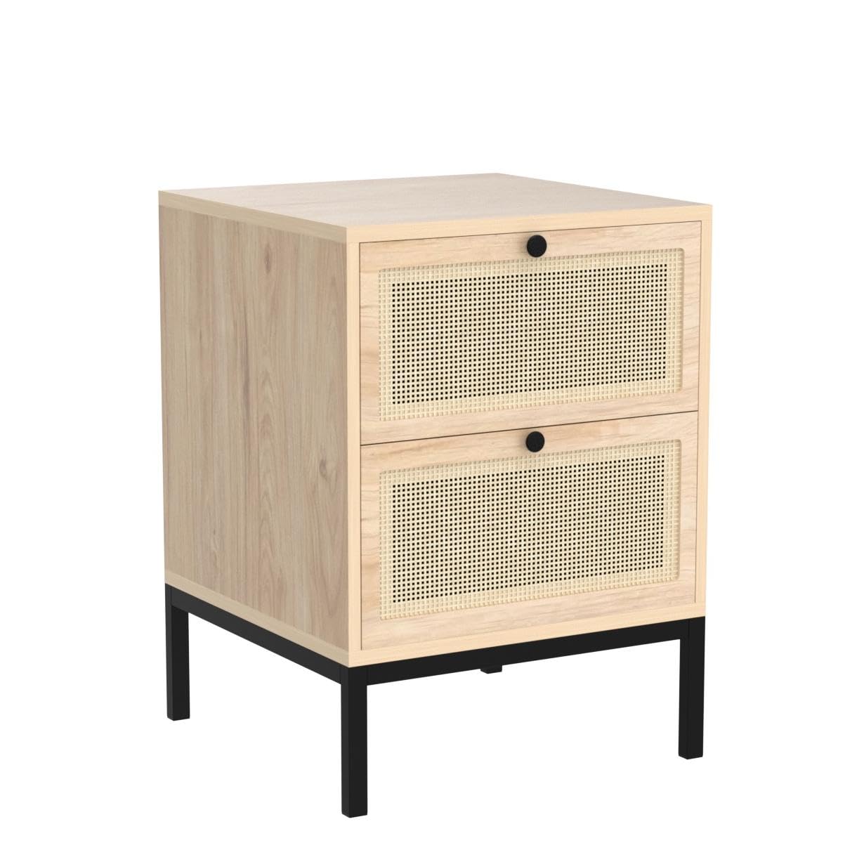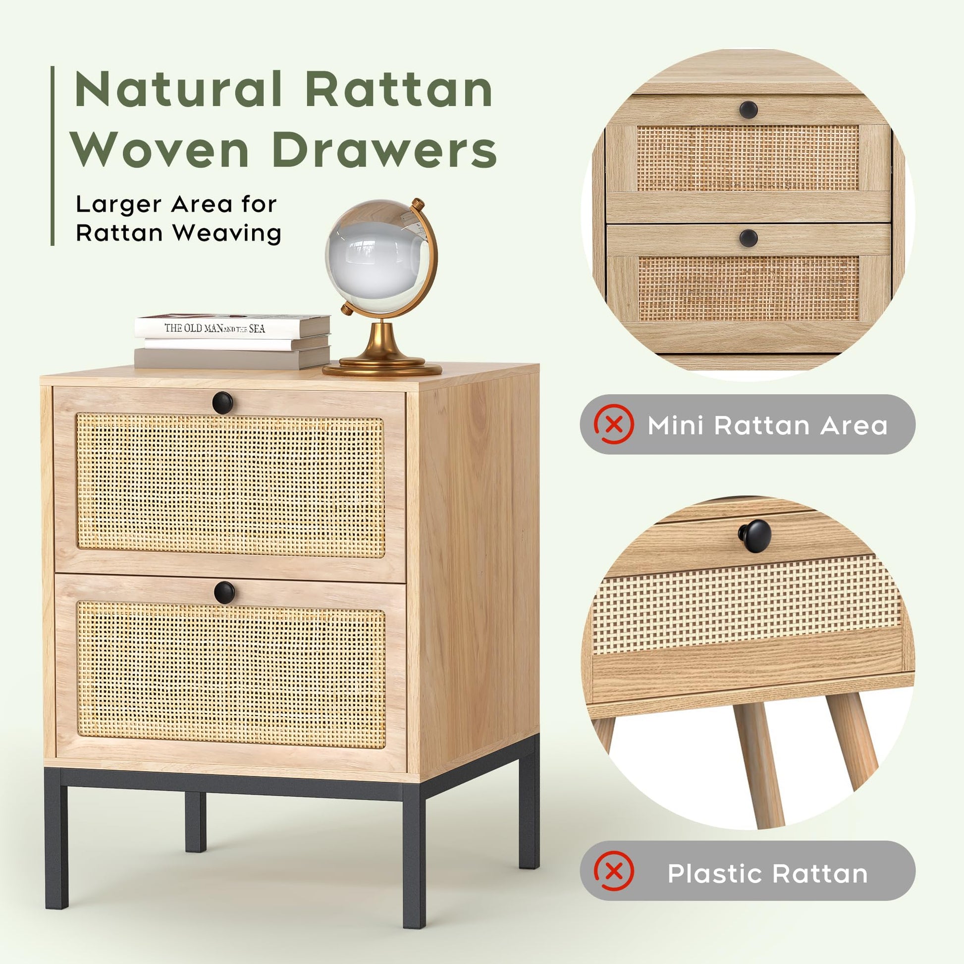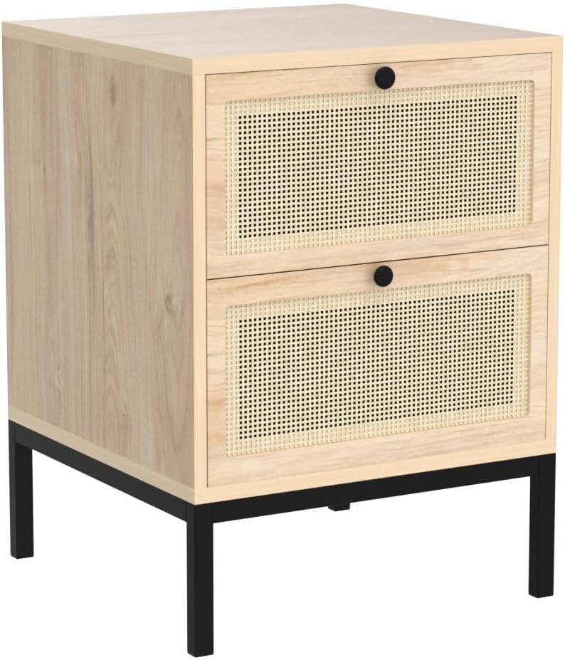 - The night stand is classic, modern and simple, it consist of smooth wood nightstand top and round metal drawer handles and minimalist metal legs, the nice handmade natural rattan, the minimalist of the bedside table with rattan drawers fit your any room d¨¦cor, At the same time, the rattan material drawers give you the different visual effect as a home decor.