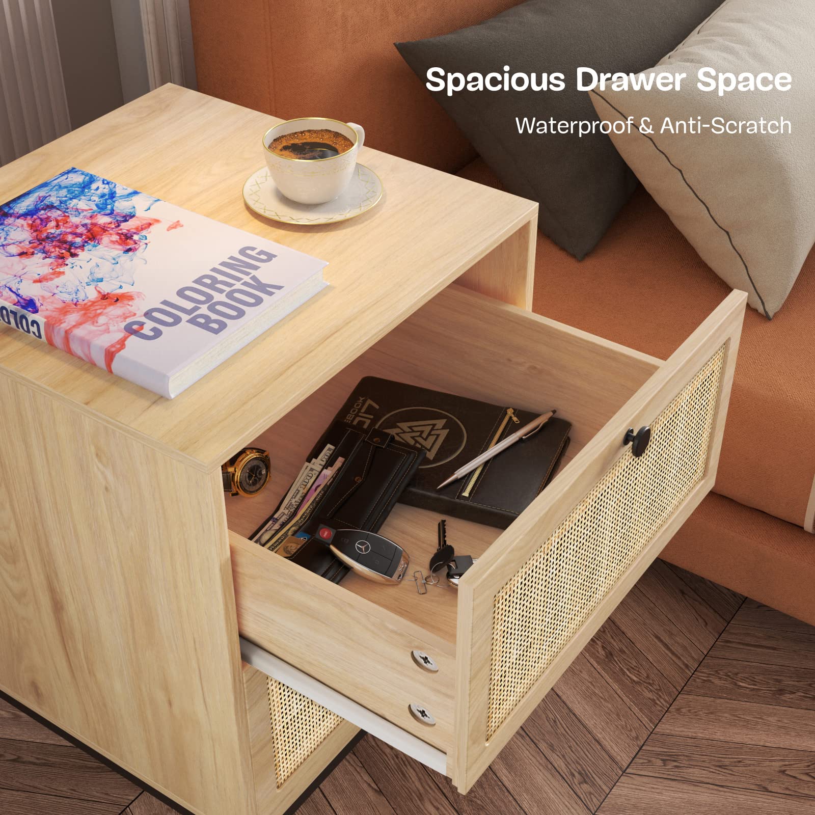 - The bed side table/night stand with 2 rattan decorated drawers not only charm your home, it also offer large space to store your accessories, toiletries, blankets, underwear, cosmetics, baby clothes, paperwork, toys etc, great to have by your bed/couch/soft, let your phone, charger, eyeglasses and other items within reach, keep your bedroom living room organized and tidy.