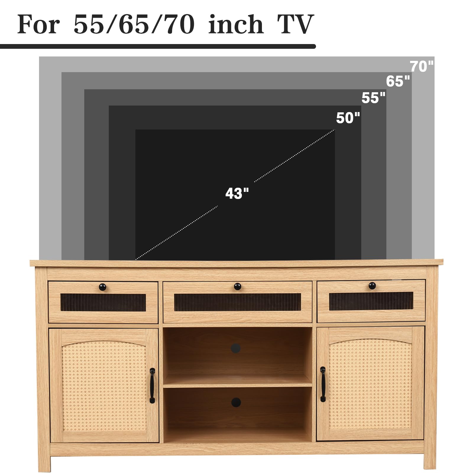 - Large Storage Space Our tall TV stand offers ample storage space, Overall size: 59” L x 15.8" W x 31" H. It features 2 cabinets with rattan doors with adjustable shelves for flexible storage, 2 open shelves, and 3 drawers. Built-in cable management keeps wires neatly organized, providing plenty of storage for your gaming consoles, routers, audio equipment, DVDs, CDs, and video games.