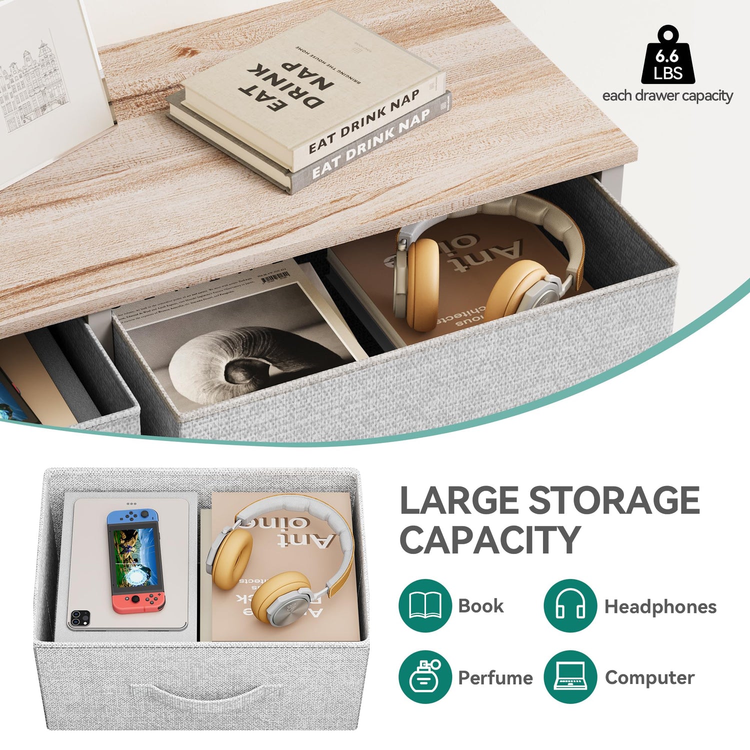 - UNIVERSAL MATCH- Premium light grey fabric drawers, sturdy white metal frame and waterproof wooden tabletop give the storage organizer a modern style. This unit easily fits in various living spaces: living rooms, bedrooms, hallways, entryways, closets and nurseries, etc.