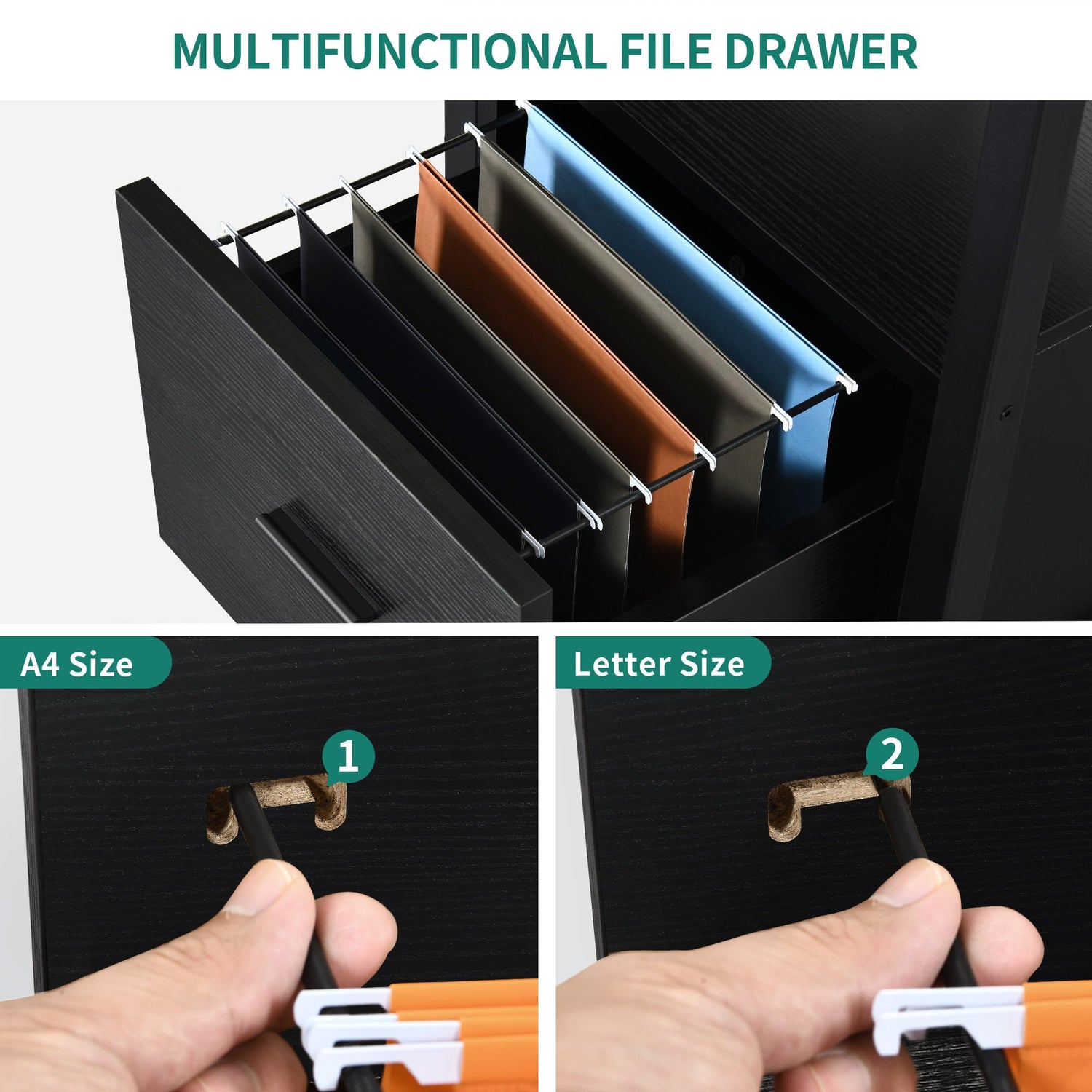 - large L-shaped desk with drawers gives you easy access to office supplies, as its printer stand holds printers, scanners, and fax machines, the file drawer hangs A4 & letter-size documents, the monitor riser extends the work surface, the monitor shelf allows you to sit on with better posture and open shelves store more office essential