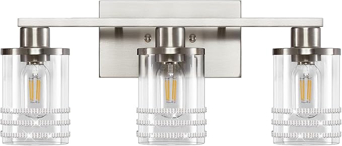 - YYT 3 Light bathroom light fixture, made of stainless steel, ultra-strong anti-rust properties, brushed nickel finish for great texture. Bathroom lighting have 3 pcs clear glass shade, the glass surface is affixed with a diamond chain for beauty and elegance, non-destructive light output, to solve the problem of insufficient brightness in the bathroom