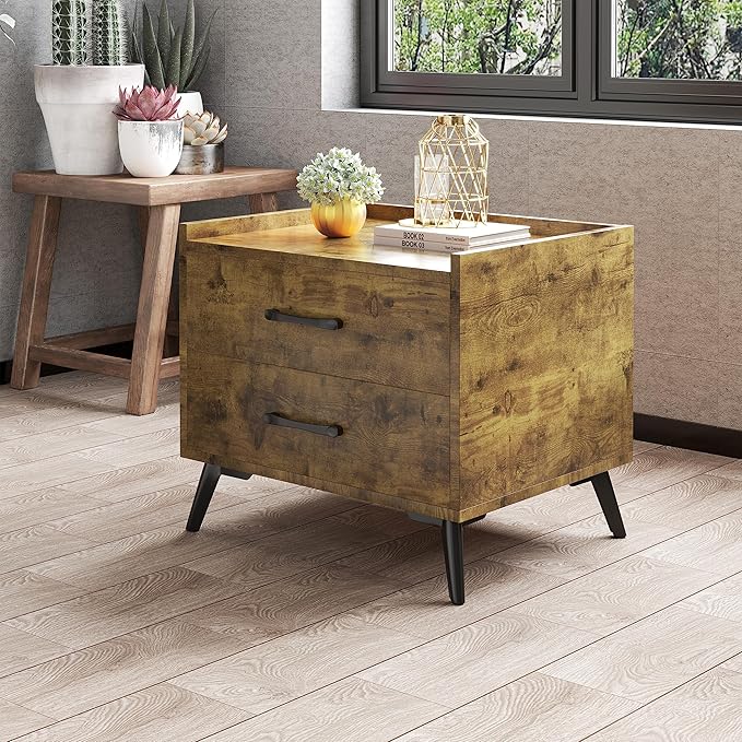 - The end side table is made of high quality fiberboard wood, scratch-resistant and wear-resistant, durable. The four iron legs of the nightstand are firmly placed in an inclined shape to prevent shaking and increase stability, and the drawer adopts upgraded mute guide rails, which is smooth and easy to operate, and improves the service life and feeling.