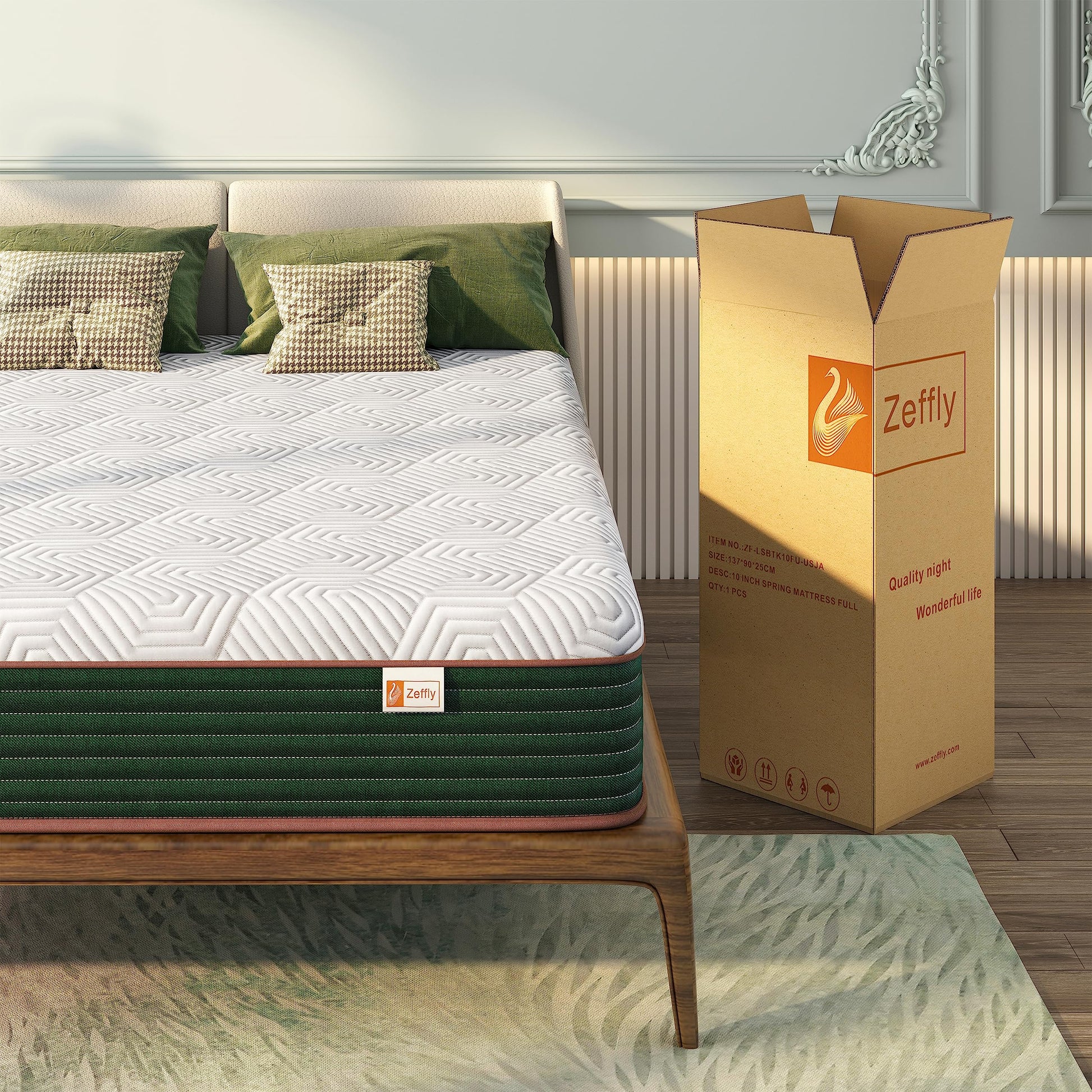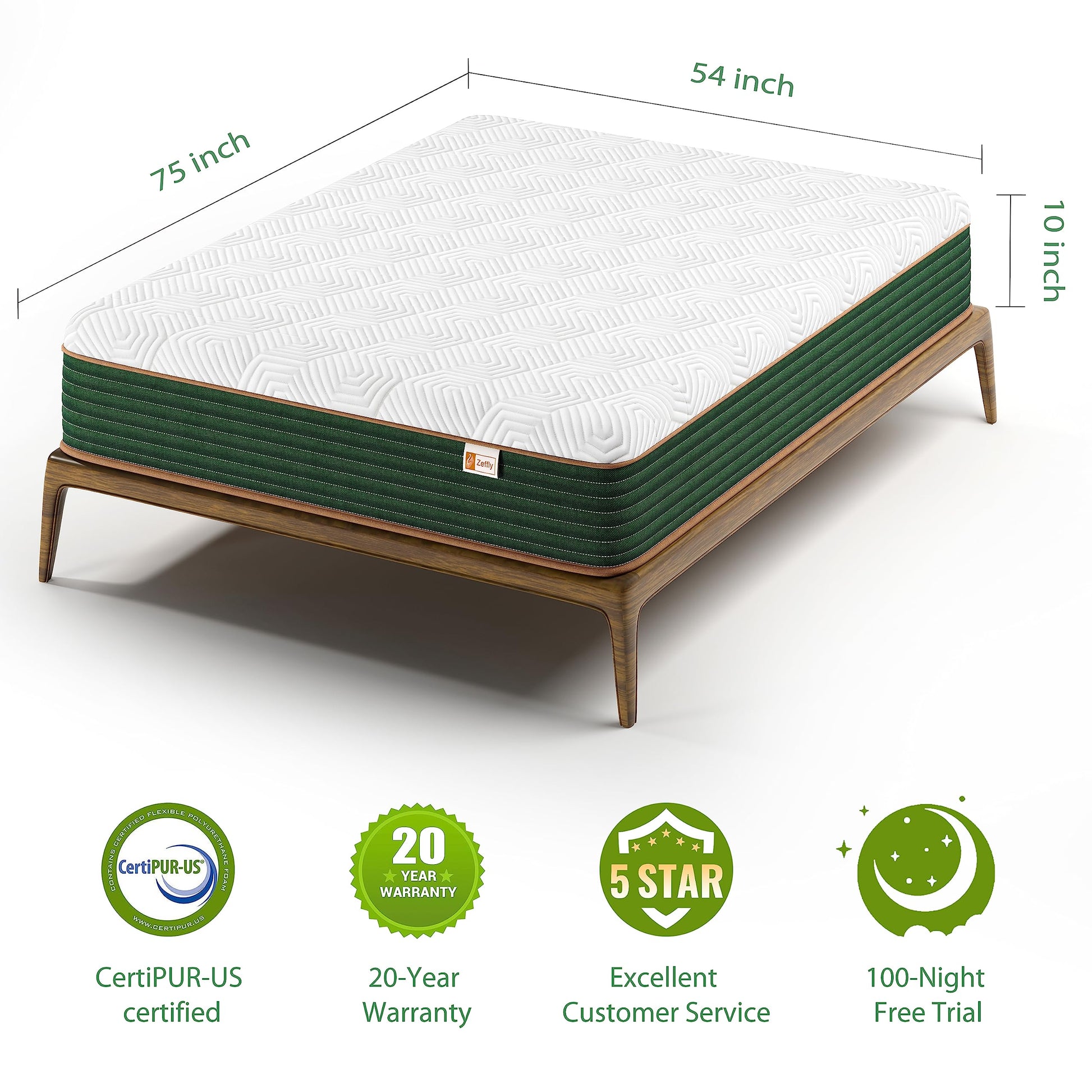 Size Full Special Feature Pressure Relief Fill Material Gel Memory Foam Product Dimensions 75"L x 54"W x 10"Th Top Style Smooth Top Color White & Green Coil Type Pocketed Coil Product Benefits Better support and stability ensure coordination and balance, and ensure no interference.