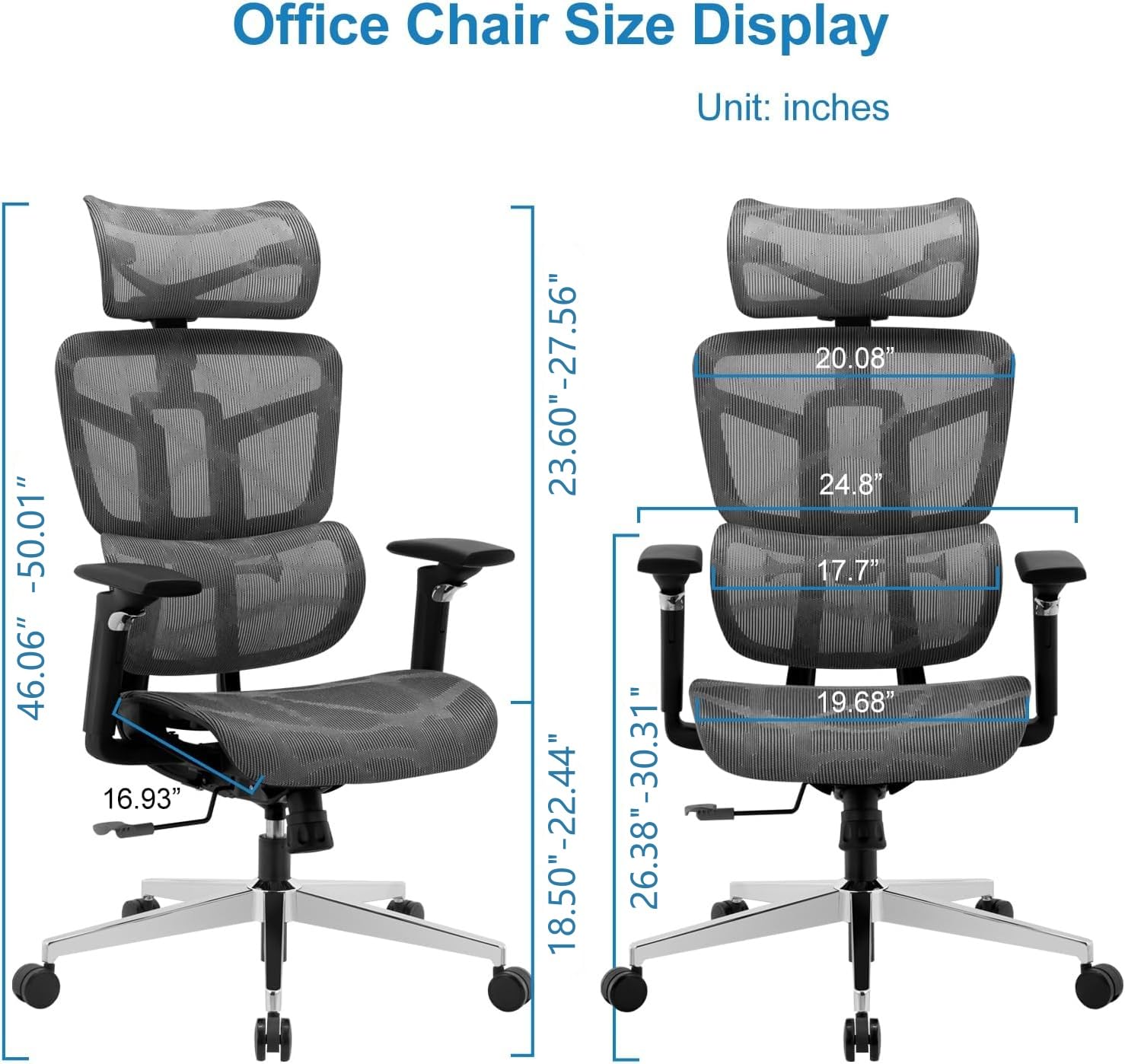 - Adjustable Office Chair ZLchair office chair has a recline function, makes you tilt the backrest back (90~135°) with the tilt lock or sit straight freely, adjustable seat height, and the headrest 45° rotation adjustment, suitable for people of different heights, not only for tall people(Applicable Height: 140-190CM), seat height adjust 18.7"-22.24". Backrest with headrest height adjusts 26.58"-31.98". 5D armrests (forwards and back, up and down, left and right rotation)