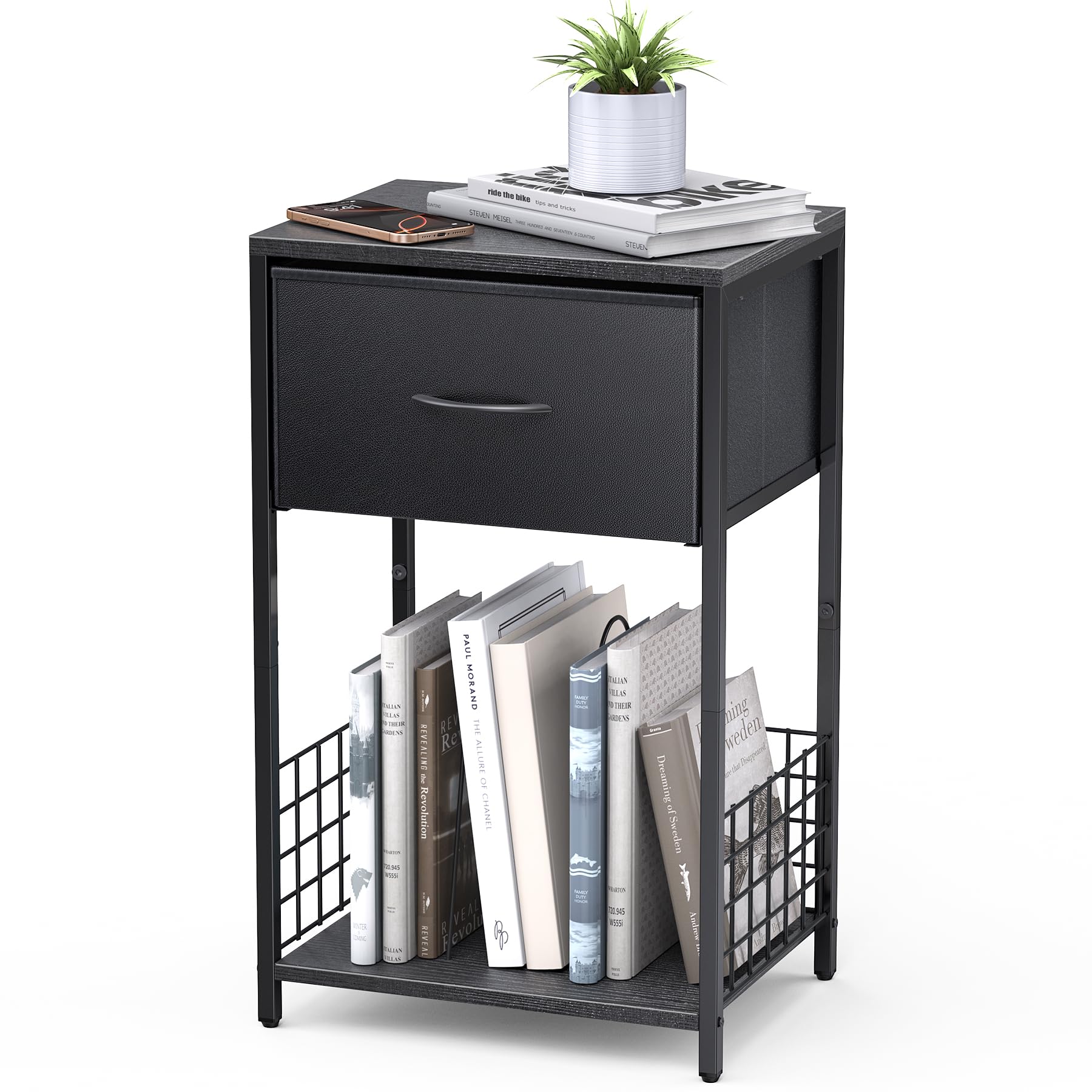 Nightstand, Side Table Bedroom with Book Shelf & Storage Drawer, Night Stand with Fabric Bin for Bedroom