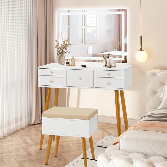 Drawers Vanity Desk with LED Mirror, Makeup Table with with 3 Color Adjustable Mirror,