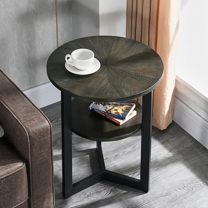 Round End Table with Storage, Solid Wood Sofa Side Table with Metal Frame