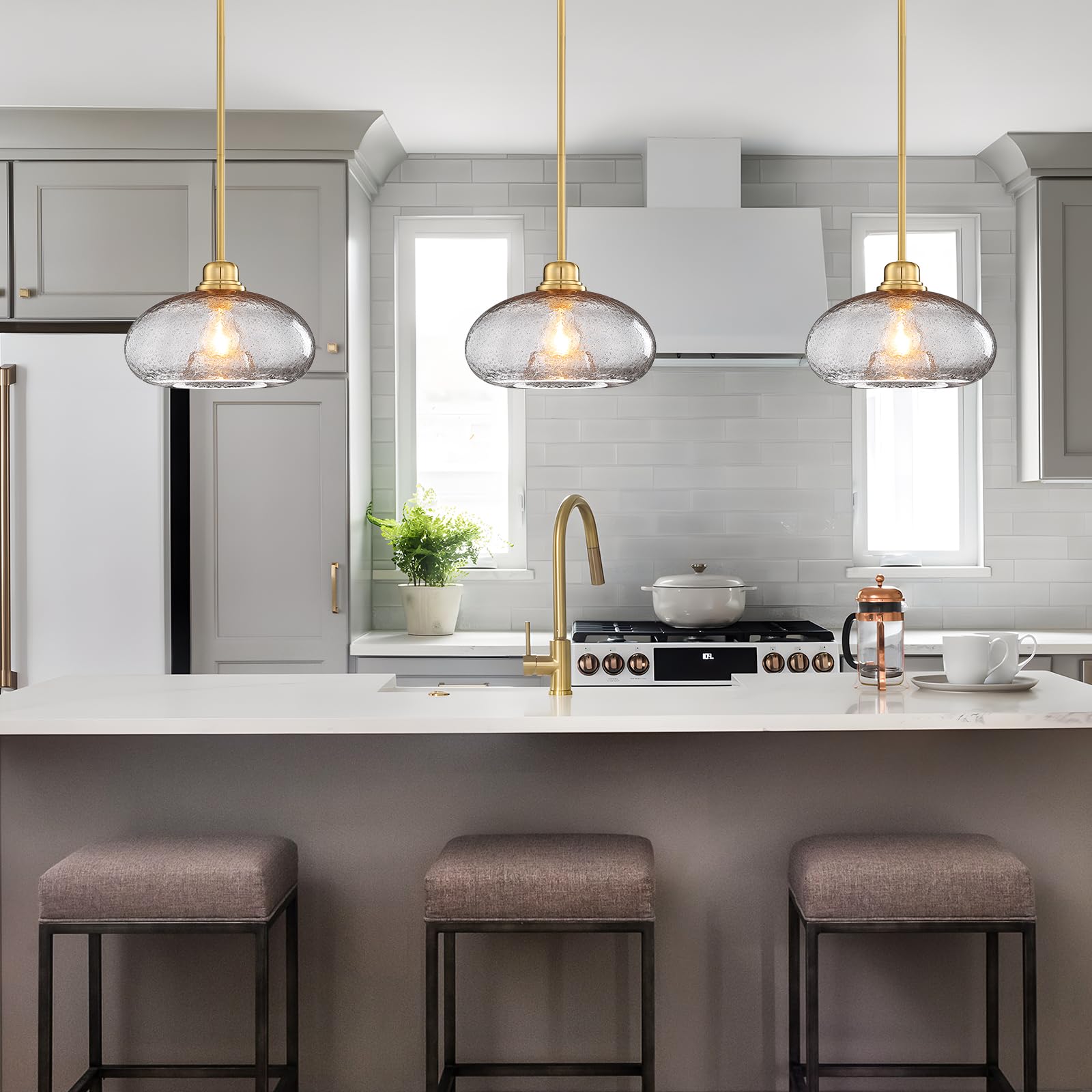 Elevate your interior spaces with these sophisticated large pendant lights. Featuring a stunning combination of modern gold finish and elegant grey seed glass shading, this 2-pack set delivers both ambient illumination and contemporary style to your kitchen island, dining room, or entryway.