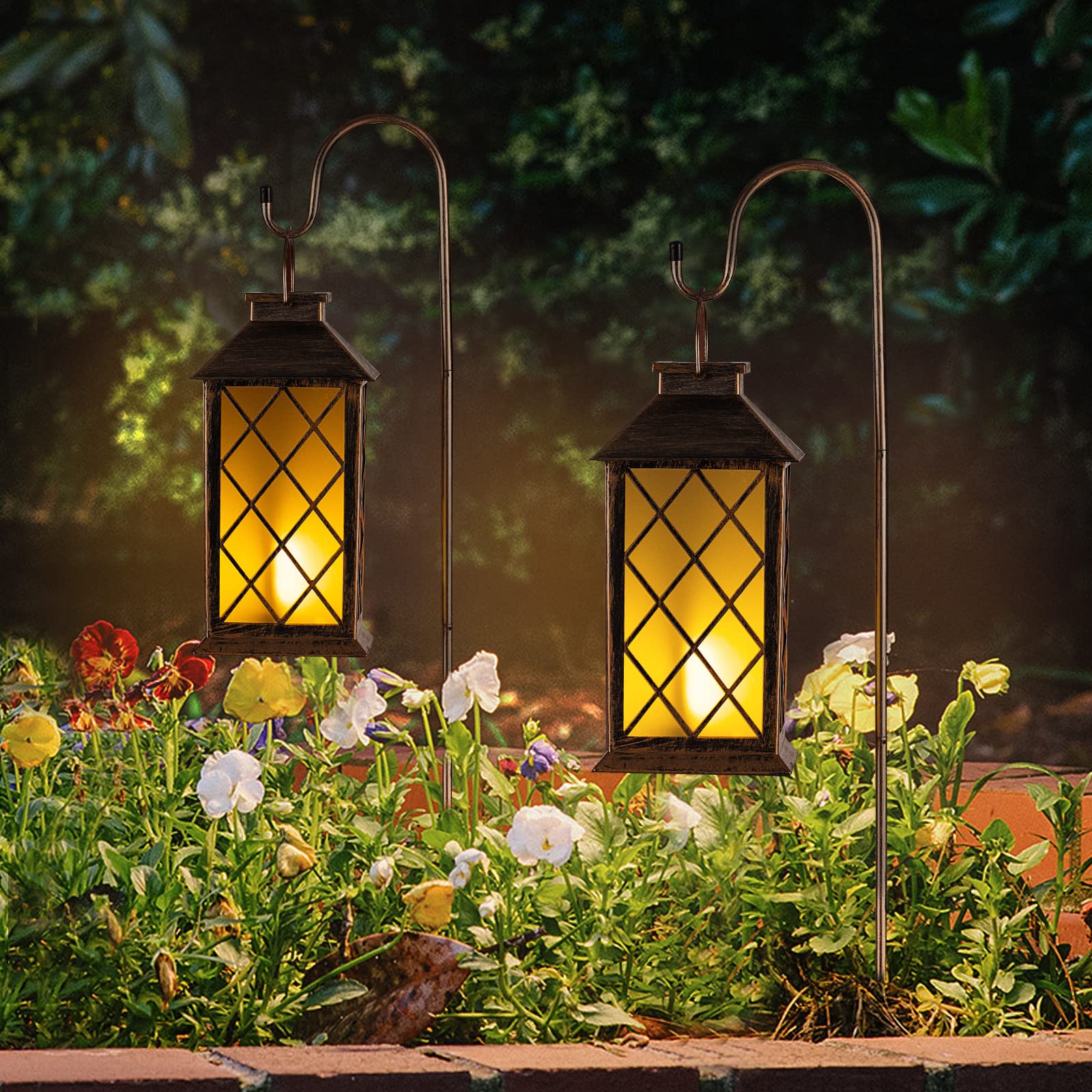 2Pack Solar Metal Hanging Lantern Flickering Candle with Shepherd Hook