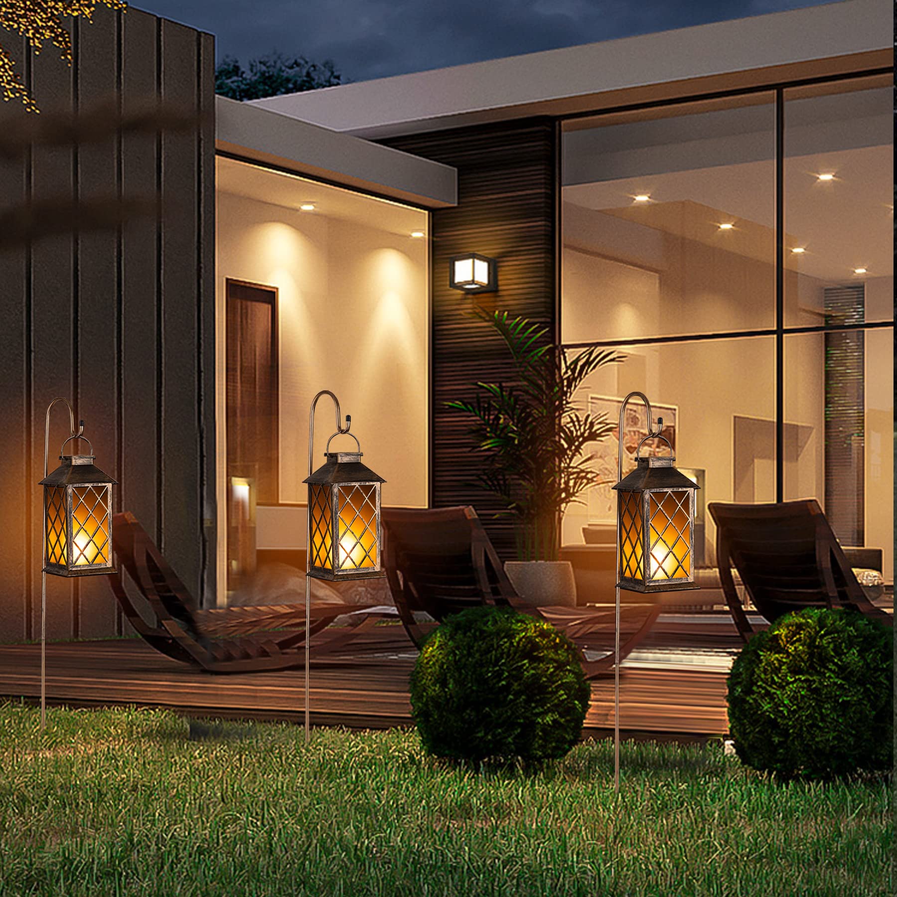 - Solar Lights with 2 Shepherd Hooks suitable for outdoor use, add a charming ambience, perfect use on pathway, decorate your garden, porch or yard. These lanterns can also be hung in other places without shepherd hook. Package includes 2 hanging solar lights, 2 shepherd hooks.