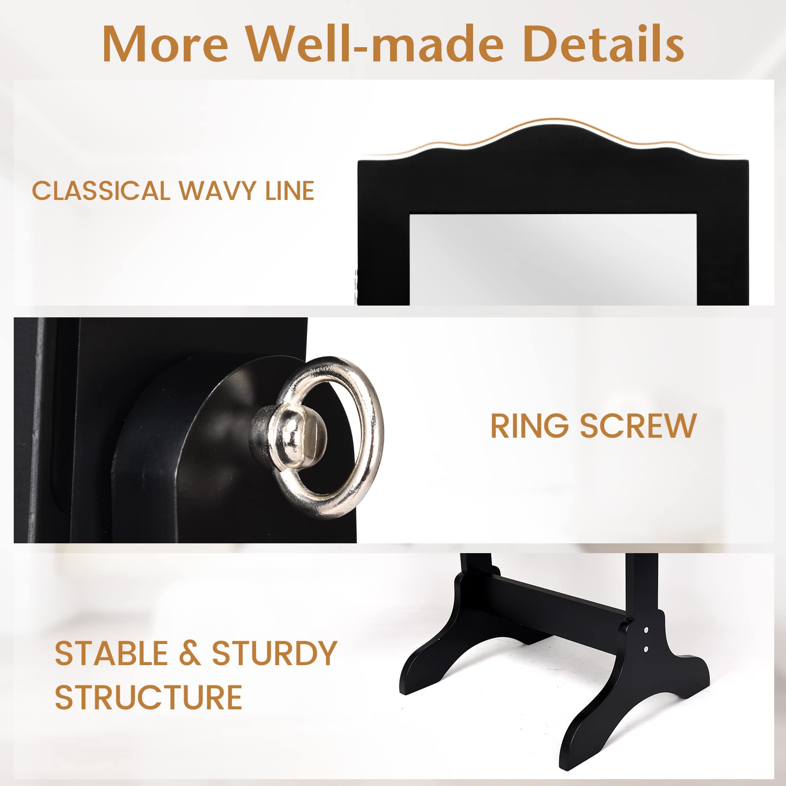 Transform your bedroom or dressing room with this elegant standing jewelry armoire featuring a full-length mirror and spacious storage capacity. The innovative 4-angle tilting design allows you to adjust the mirror to your perfect viewing angle, while the lockable cabinet keeps your precious jewelry secure and organized.